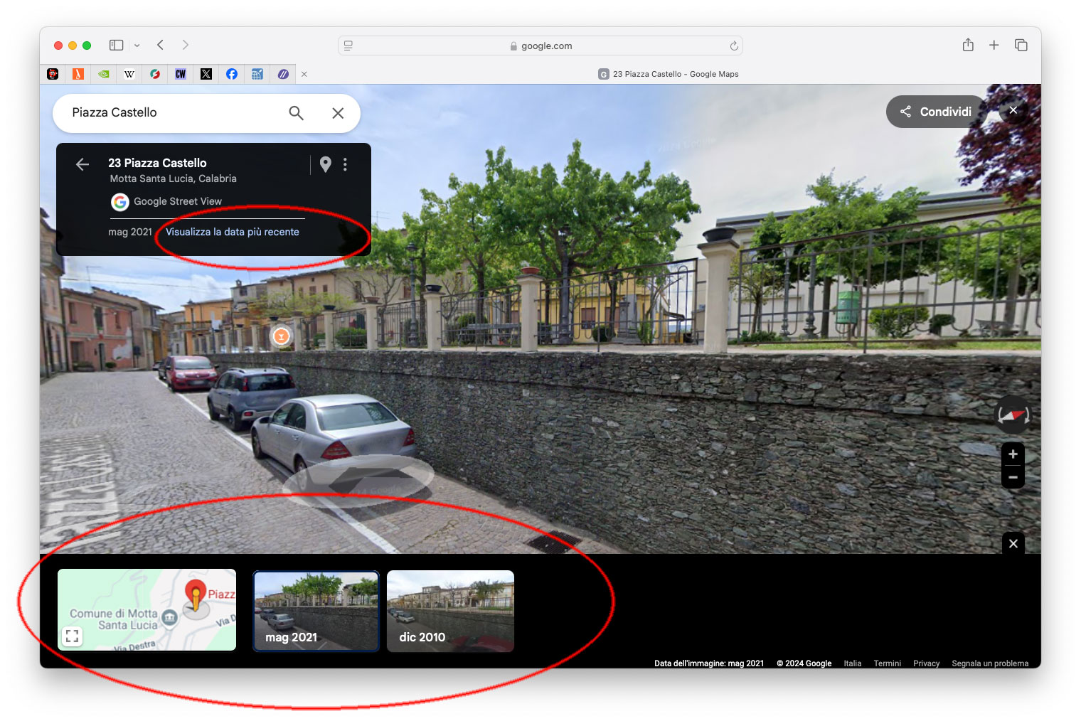 Dal telefono (iOS o Android) basta acceder a Street View in Google Maps, cerca un luogo o inserire un segnaposto sulla mappa, toccare la miniatura con l’icona di Street View; se sono presenti immagini che risalgono a anni precedenti, appare l’opzione “”Vedi altre date”.