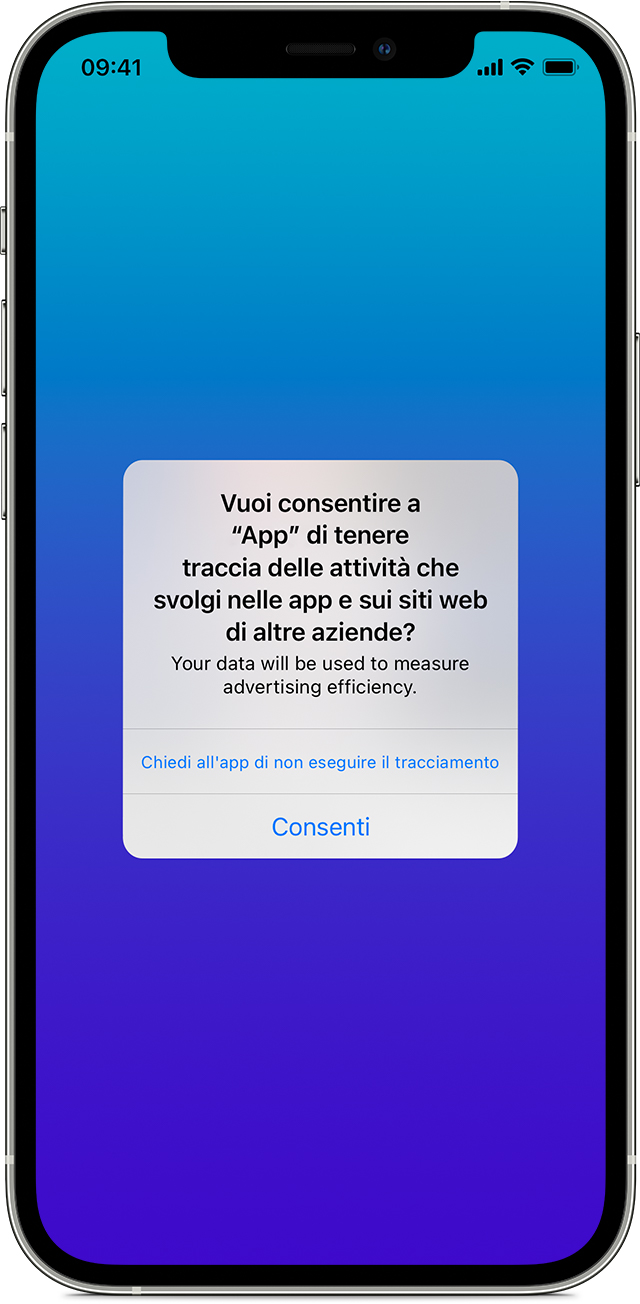 Da iOS 14.5/iPadOS 14.5 le app devono chiedere l’autorizzazione prima di monitorare la nostra attività su app e siti web di altre aziende. Il tracciamento si verifica quando le informazioni che identificano noi o il nostro dispositivo raccolte da un’app vengono collegate a informazioni che identificano noi o il nostro dispositivo raccolte da app, siti web o altre piattaforme di proprietà di terze parti per scopi legati all’invio di annunci personalizzati o alla misurazione della pubblicità, oppure quando le informazioni raccolte vengono condivise con i cosiddetti “data broker”. Scegliendo l’opzione che consente di chiedere a un’app di non eseguire il tracciamento, lo sviluppatore dell’app non potrà accedere all’identificativo per gli inserzionisti (IDFA) del sistema, solitamente utilizzato per eseguire il tracciamento. Inoltre, all’app non sarà consentito tracciare le nostre attività utilizzando altre informazioni che identificano noi o il nostro dispositivo, come ad esempio il nostro indirizzo email.