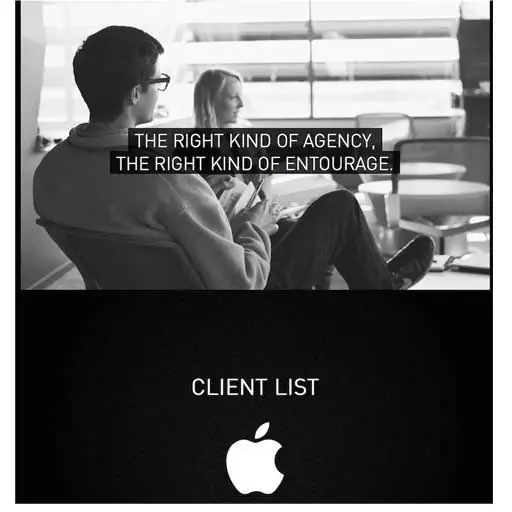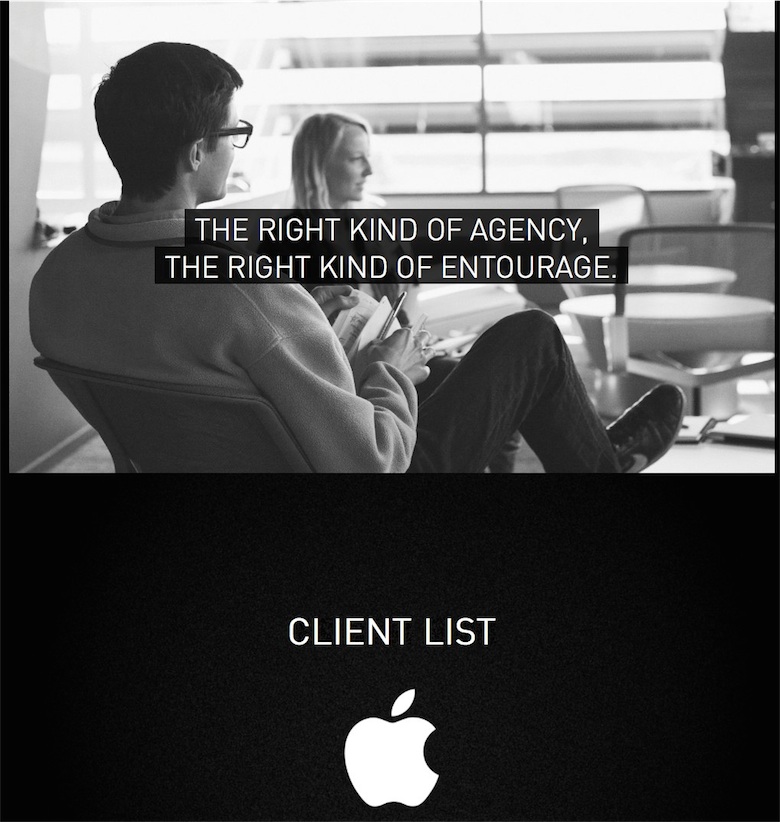 La peculiarità è sottolineata dalla home page. Qui sotto la lista dei clienti di Level Studios (che ha sedi a San Louis Obispo, San Josè e Londra) non ci sono nomi nè una lista, ma solo un logo: una Mela bianca su fondo nero.