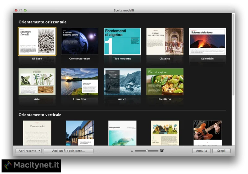 All’avvio è possibile selezionare alcuni modelli sviluppati da Apple modificabili a piacimento (i modelli di default sono nove con layout orizzontale e sei con layout verticale). Tutto quanto necessario per creare un libro è visualizzato in una finestra: capitoli, sezioni e pagine sono visualizzati nella barra laterale; Il resto della finestra è il “luogo” che consente di creare e personalizzare i contenuti.