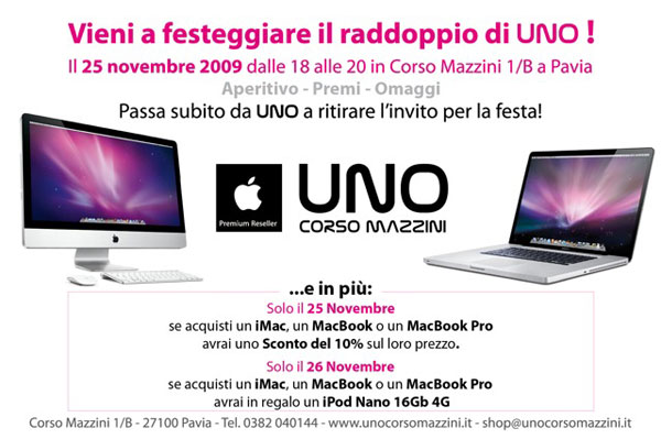 I festeggiamenti continuano anche giovedì 26 novembre: per ogni Mac acquistato UNO Corso Mazzini offre in omaggio un iPod nano di quarta generazione da 16GB. Per maggiori informazioni rimandiamo al sito Web ufficiale di UNO.