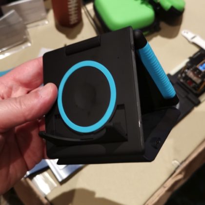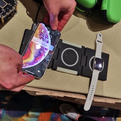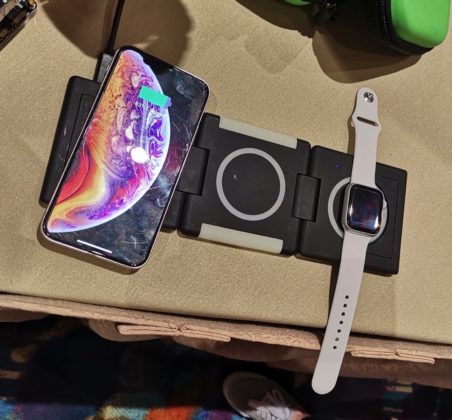 Avvistato da un nostro inviato durante l’evento, questo caricatore è caratterizzato da un sistema di cerniere in attesa di essere brevettato che consente la massima flessibilità e portabilità. Chiuso occupa pochissimo spazio in borsa o in valigia mentre aprendolo offre spazio per la ricarica wireless di ben tre dispositivi contemporaneamente.