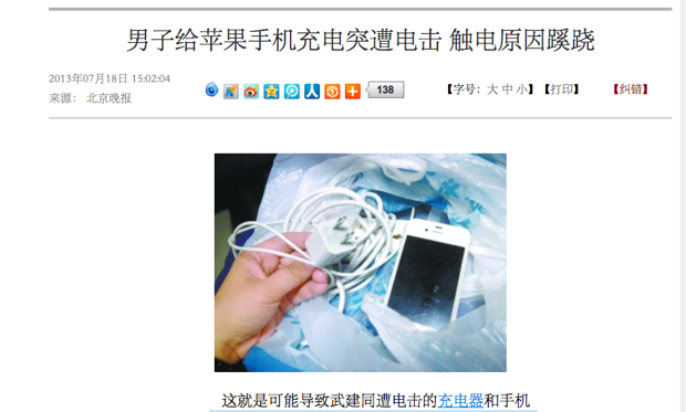 In Cina un giovane uomo di 30 anni è stato folgorato mentre collegava il proprio iPhone 4 a un alimentatore non originale per la ricarica. L’incidente è avvenuto l’8 luglio ma la notizia dell’accaduto sta circolando solo in queste ore, probabilmente la pubblicazione è avvenuta solo in seguito al clamore suscitato dall’incidente che ha causato la morte di Ma Ailun, giovane hostess 23enne di cui Macitynet ha già riferito qui e anche qui.