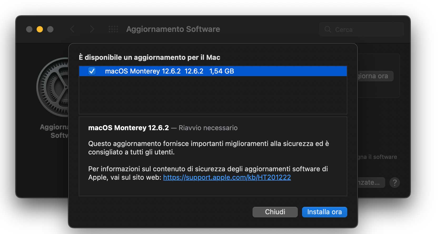 Se non volete ancora installare macOS Ventura, potete ottenere l’update a Safari 16.2 aprendo le Preferenze di Sistema e selezionando “Aggiornamento software”: da qui è possibile installare il nuovo macOS Ventura, oppure aggiornare semplicemente l’attuale sistema selezionando dalla finestra in questione la voce “Ulteriori informazioni” e installando l’update per Big Sur o macOS Monterey.