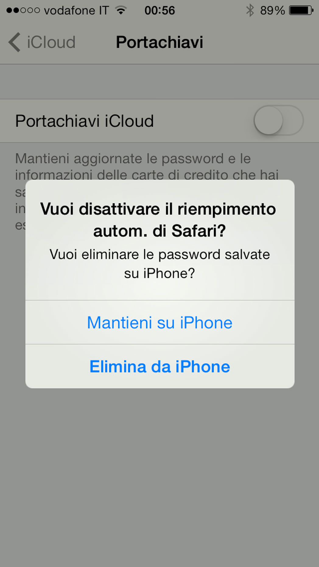Per disattivare la sincronizzazione tra dispositivi, quindi impedire che gli altri dispositivi usino le password e le carte di credito memorizzate, potremo spegnere l’interruttore in Impostazioni –> iCloud –> Portachiavi iCloud. In questo modo continueremo ad avere accesso all’auto compilazione e la memorizzazione sul dispositivo locale secondo le nostre preferenze, ma non riceveremo password e carte di credito sugli altri dispositivi connessi allo stesso Apple ID.