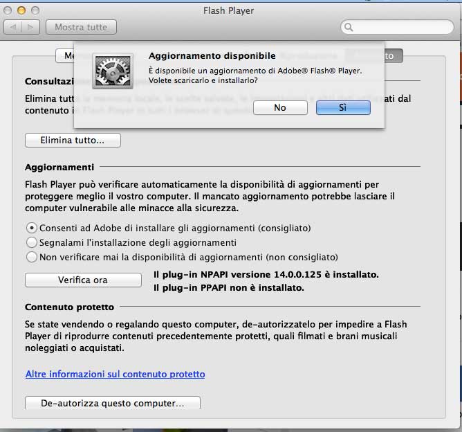 Se il Flash Player è già presente nel sistema, è possibile verificare la presenza di aggiornamenti portandosi nelle Preferenze di Sistema e da qui scegliendo “Flash Player” e “Verifica Ora” nella sezione “Avanzato”. In alternativa il pacchetto completo si scarica da qui (sono 15,5MB).