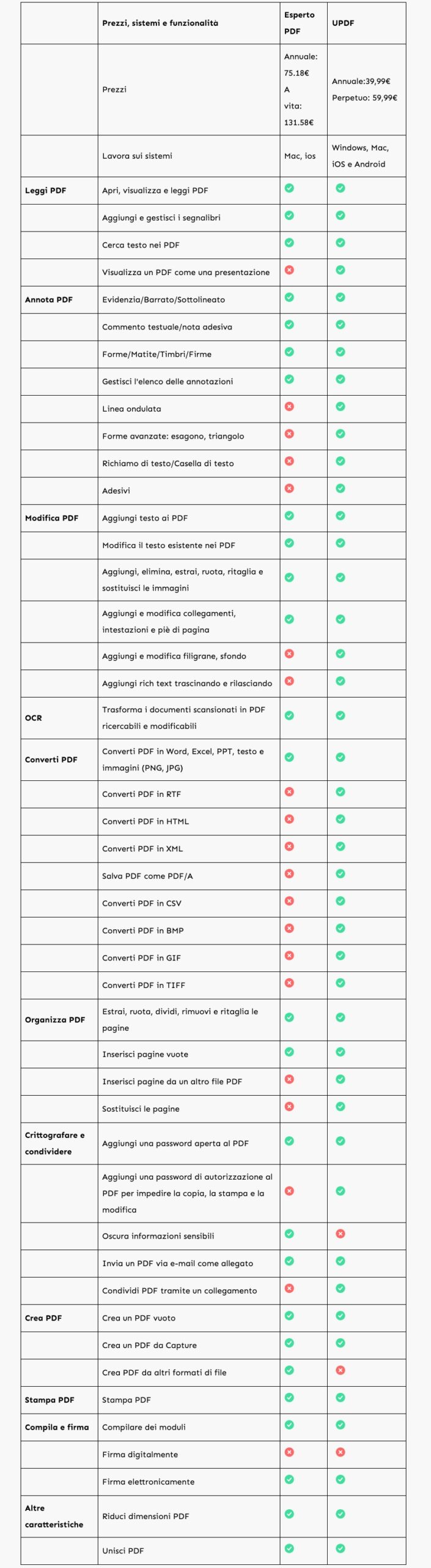 Qui di seguito è riportata una tabella di confronto tra UPDF e PDF Expert: