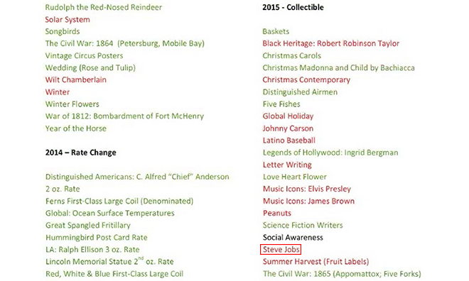 L’United States Postal Service (USPS), agenzia indipendente del Governo responsabile del servizio di posta negli Stati Uniti, emetterà un francobollo commemorativo dedicato a Steve Jobs, co-fondatore di Apple . L’informazione risulta dalle liste del Citizens’ Stamp Advisory Committee (CSAC) e si apprende che l’emissione è prevista per il 2015; oltre al francobollo che raffigura Jobs sono previsti altri con protagonisti come Johnny Carson e figure iconiche quali quelle delle strisce dei Peanuts (il fumetto di Schulz).