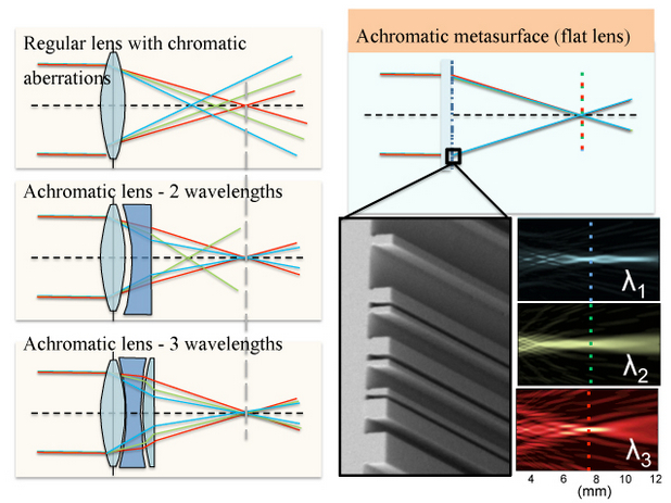 Nelle lenti tradizionali, la luce in entrata soffre di aberrazioni cromatiche, perché le diverse lunghezze d’onda della luce sono focalizzate in diversi punti. Le aziende devono quindi includere elementi aggiuntivi al fine di risolvere questi problemi e mettere a fuoco tutte le lunghezze d’onda nello stesso punto.