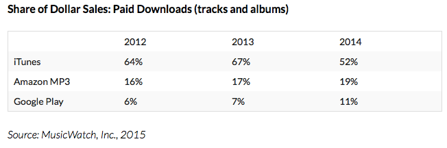 Da settimane si parla molto di servizi in streaming, ed è noto che anche Apple sta preparando un nuovo servizio ad hoc ma recenti investigazioni di MusicWatch, società specializzata in ricerche di mercato per l’industria musicale, evidenziano che i consumatori non hanno del tutto abbandonato il mercato dei download a pagamento. Di fatto, un terzo dei consumatori statunitensi lo scorso anno ha acquistato musica in questo modo e su dieci clienti che hanno scaricato brani a pagamento, 7 l’hanno fatto da iTunes. In pratica Apple ha ceduto alcune quote del suo mercato ad Amazon MP3 e Google Play, ma resta leader nei download. Negli Stati Uniti il fattutato diTunes nel download della musica è sceso passando dal 67% del 2013 al 52% del 2014; Amazon MP3 ha guadagnato due punti percentuali e Google Play è aumentato di quattro punti.