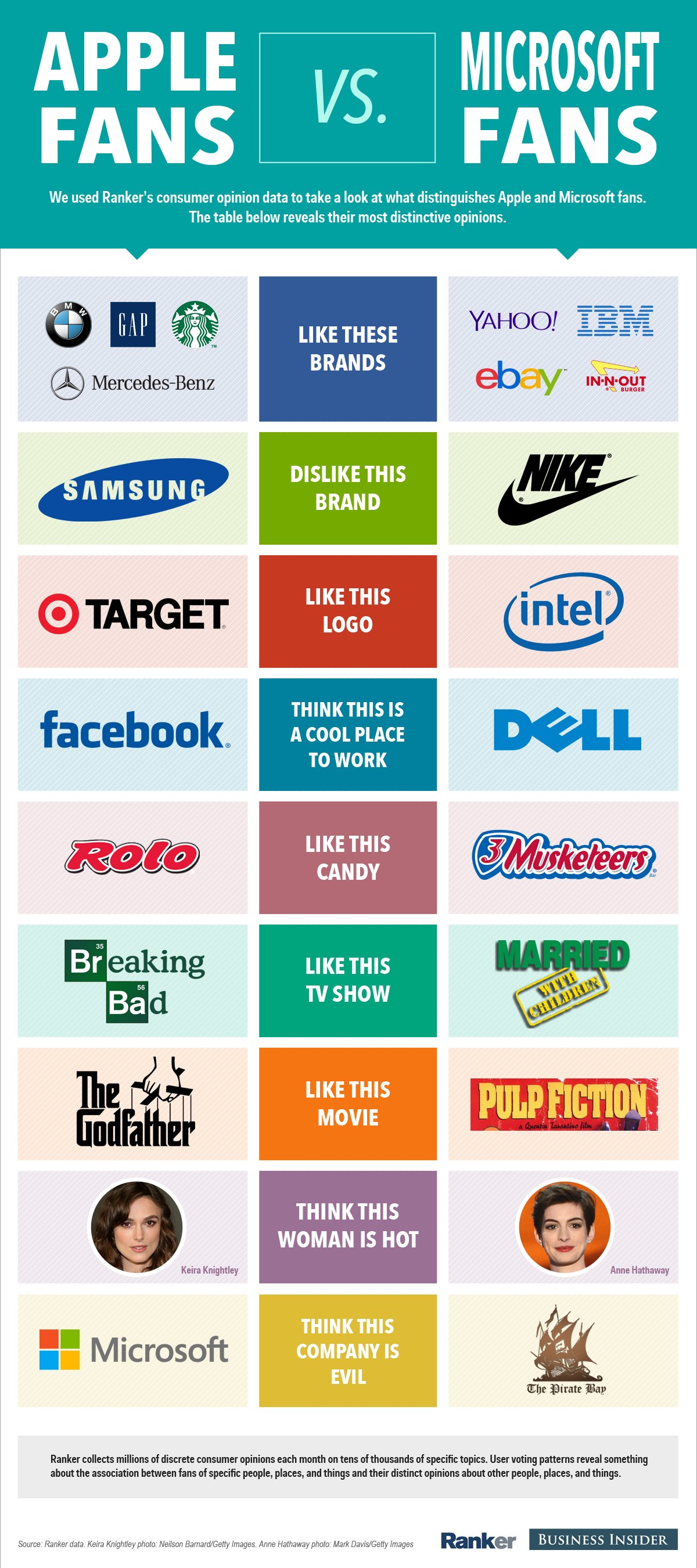 I fan Apple adorano marchi come BMW, Mercedes, Gap e Starbucks, mentre quelli Microsoft preferiscono Yahoo, IBM, eBay e In-N-Out. Ancora, i primi odiano Samsung, considerato il rivale di sempre, mentre ai secondi non va proprio a genio il brand Nike. Gli utenti Apple, inoltre, pensano a Facebook come al luogo ideale per lavorare, mentre per l’utenza Microsoft è Dell ad essere il datore di lavoro preferibile. Tra le altre curiosità, proprio in fondo alla tabella, si ravvisa che gli utenti Apple pensano a Microsoft come al male in persona, mentre questi ultimi non additano la casa di Cupertino come se fosse il diavolo, ma puntano il dito contro il portale The Pirate Bay. Di seguito tutti i gusti delle due rispettive fazioni.