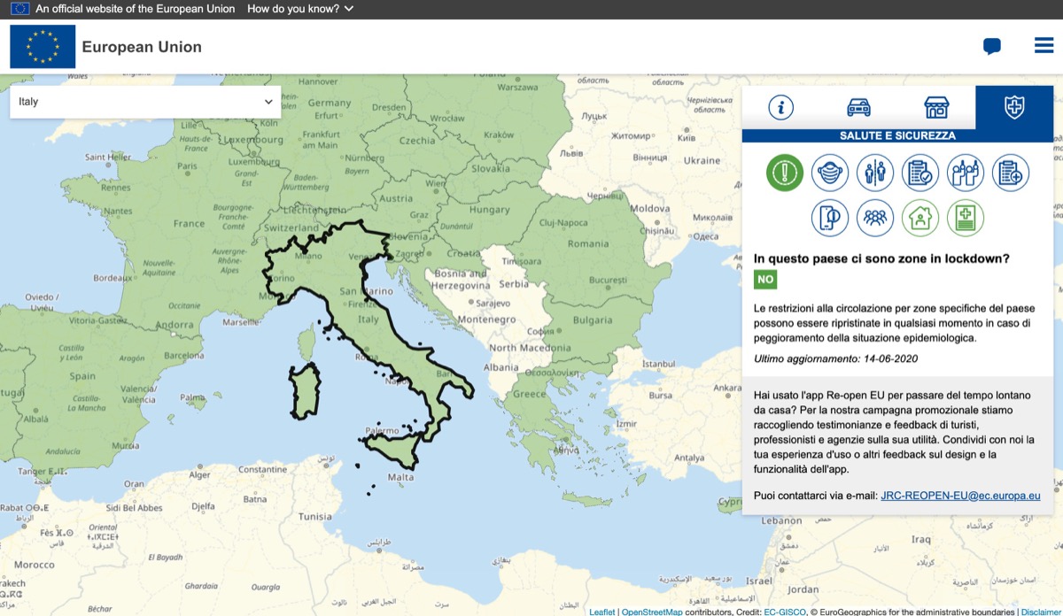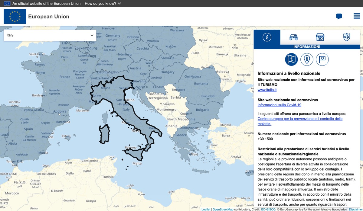 Nel primo, etichettato da una (i), è possibile leggere le informazioni principali a livello nazionale, quelle di tipo regionale e le eventuali iniziative UE presenti nell’area, con tanto di link utili che permettono di approfondire il discorso. Col secondo, contrassegnato dal simbolo stilizzato di un’automobile, si troveranno le risposte a tutte le domande concernenti i vari spostamenti da e verso il paese. Il terzo pannello è denominato servizi e qui si possono trovare tutte le informazioni che riguardano la disponibilità di attività e luoghi come musei, chiese, negozi, bar, ristoranti e quant’altro. L’ultima scheda risponde ai dubbi relativi a salute e sicurezza, segnalando le zone di lockdown (se presenti) e gli eventuali obblighi concernenti l’uso della mascherina (e dove) e il mantenimento della distanza fisica tra le persone, se si può entrare solo previa quarantena e la disponibilità di eventuali protocolli speciali per i turisti.