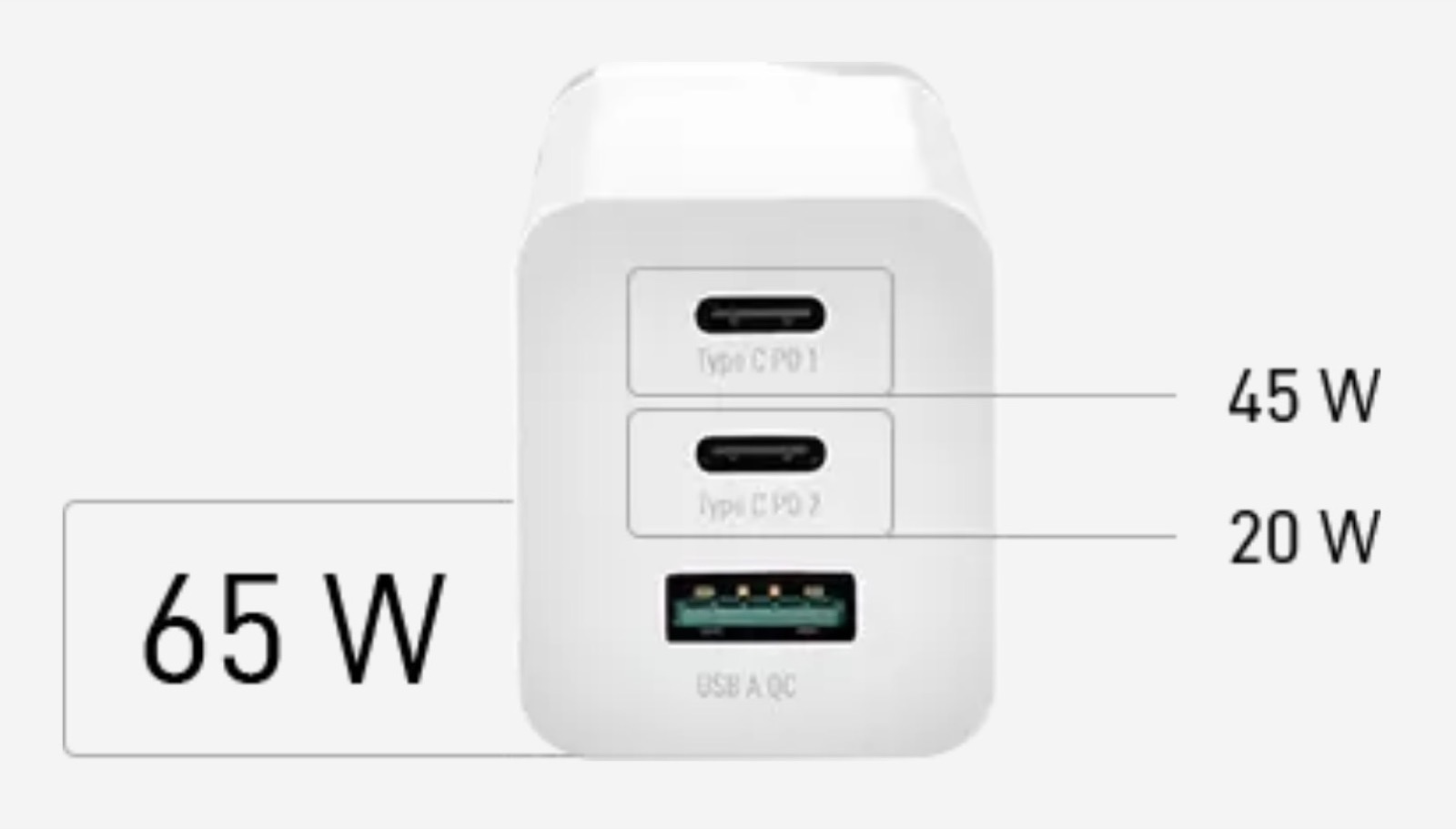Presenta il logo VARTA stampato in modo discreto con una finitura lucida sul compatto corpo bianco e nonostante le sue dimensioni ridotte, singolarmente ciascuna porta USB-C PD eroga 65 Watt, mentre se vengono utilizzate entrambe le porte insieme i watt vengono suddivisi in un rapporto di 45 Watt e 20 Watt; la terza porta USB-A QC è invece pensata principalmente per smartphone e tablet.