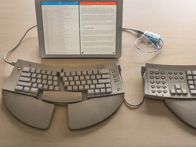 È possibile collegare a un iPad Pro del 2015, una vecchissima tastiera Apple del 1993? Sì: lo dimostra Kevin Macleon di Afterpad che ha sfruttato per il collegamento della tastiera ADB l’adattatore ADB/USB iMate prodotto da Griffin, a sua volta collegato all’adattatore Lightning/USB di Apple. Questo accessorio di Griffin era stato presentato ai tempi dei primissimi iMac (“Bondie Blu”) per consentire agli utenti di questi computer l’uso di dispositivi ADB (un bus seriale sviluppato da Apple implementato sui vecchi Mac fino al 1998 e pensato principalmente per l’uso di mouse e tastiere). Stando a quanto riporta il sito di Griffin l’iMate funziona con OS X 10.3 ma evidentemente iOS integra del codice che permette di riconoscere e sfruttare l’adattatore.