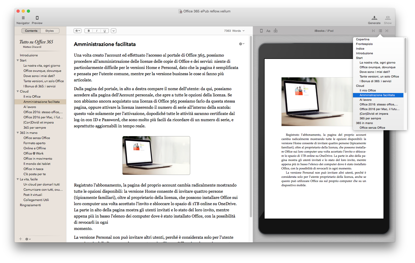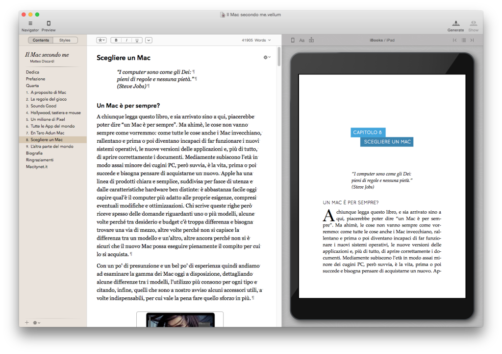 Qui in Macity Vellum è stato un toccasana, perché ci ha permesso di concentrarci nella scrittura senza per questo dovere, in ogni momento, preoccuparci di tutti gli aspetti della pubblicazione, ai quali pensa l’app Vellum in modo del tutto automatico.