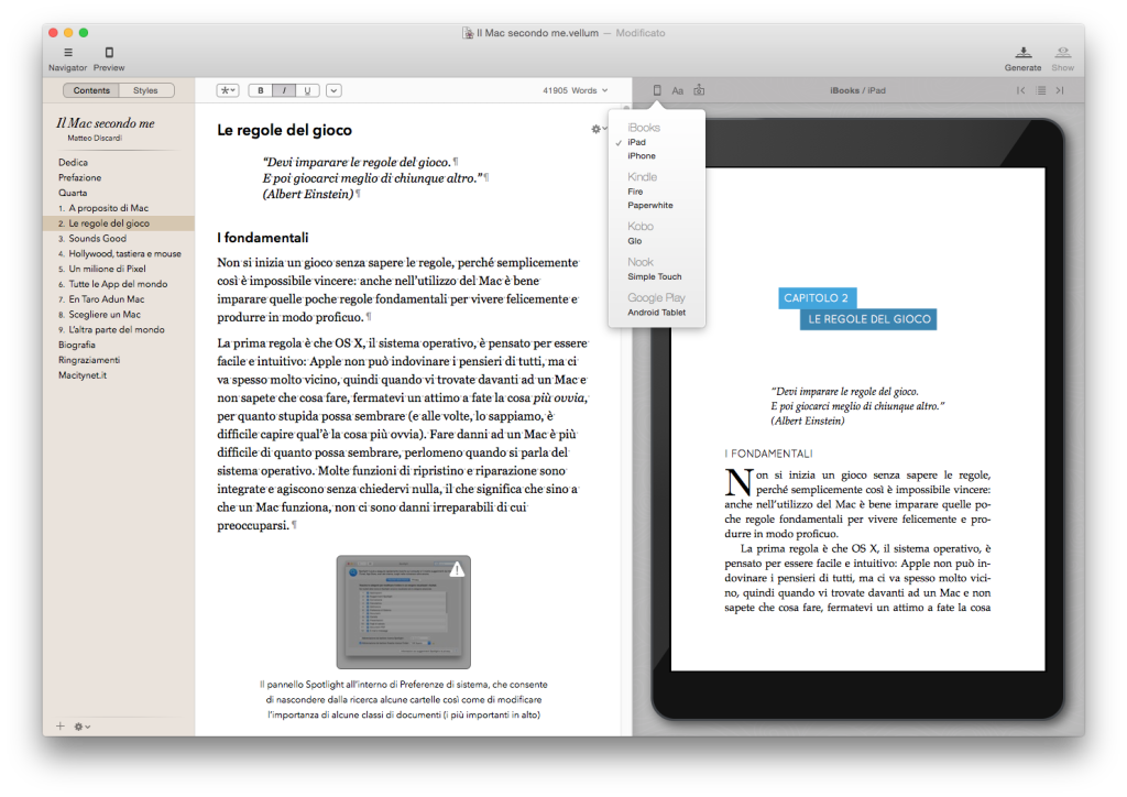 Sulle pagine di Macitynet abbiamo già parlato di Vellum, software che abbiamo iniziato ad utilizzare durante la realizzazione del libro Il Mac secondo me – Trucchi, consigli e curiosità sul Mac in generale, ebook disponibile a 5,99 euro sia su iBooks Store che su Amazon Kindle: la scelta di utilizzare Vellum per la creazione dell’ePub (e della versione per Kindle) è dovuta essenzialmente al fatto che l’App si presenta come un editor di testo molto semplice, pulito ma con grandi potenzialità nella creazione finale di eBook.