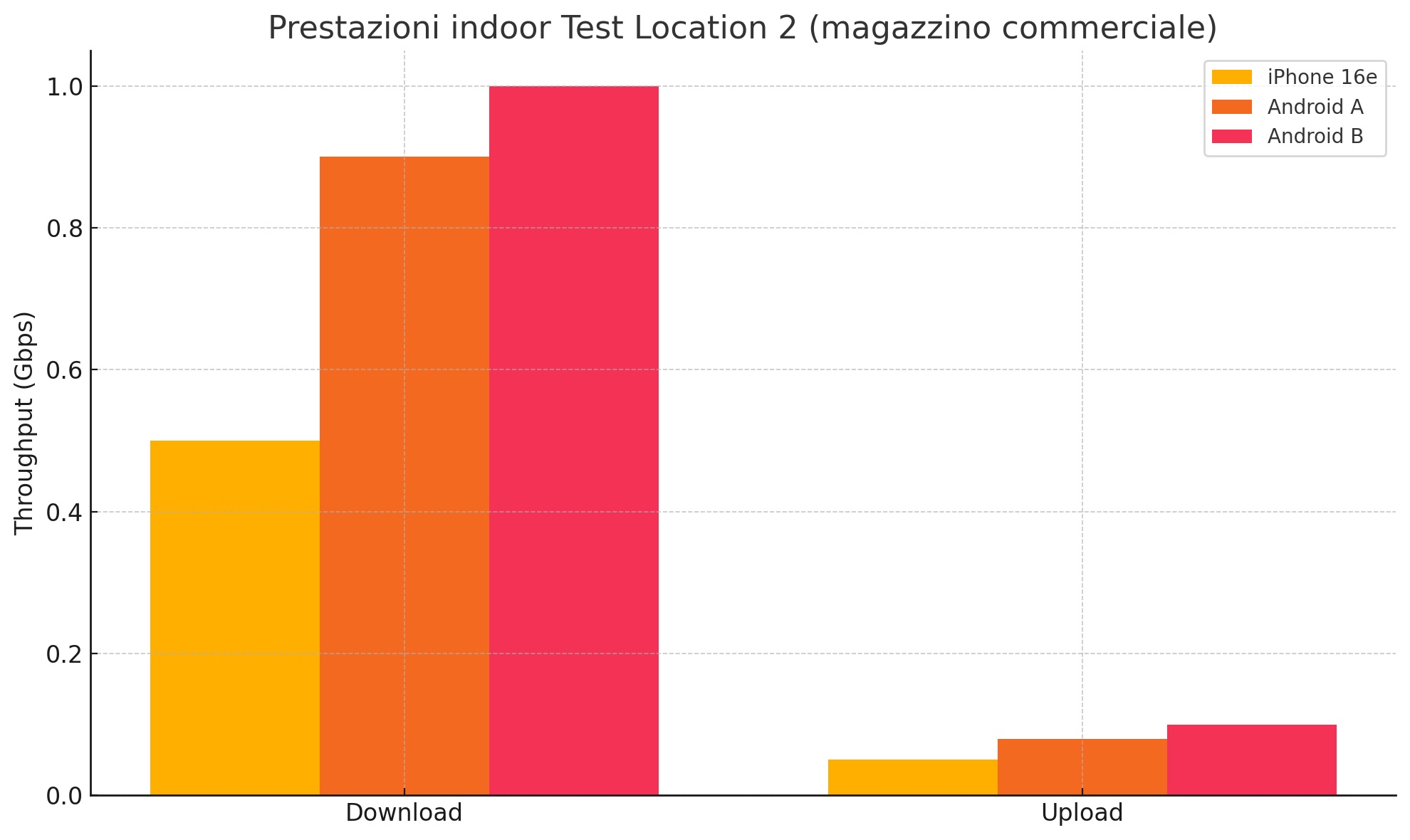 - Nei casi più difficili, gli ambienti far-cell — come magazzini o edifici rinforzati — il divario si amplia ancora: lo studio riferisce che gli Android mantengono velocità di download fino al +108% e upload anche doppi rispetto all’iPhone, che in queste situazioni può scendere sotto i 10 Mbps in upload.