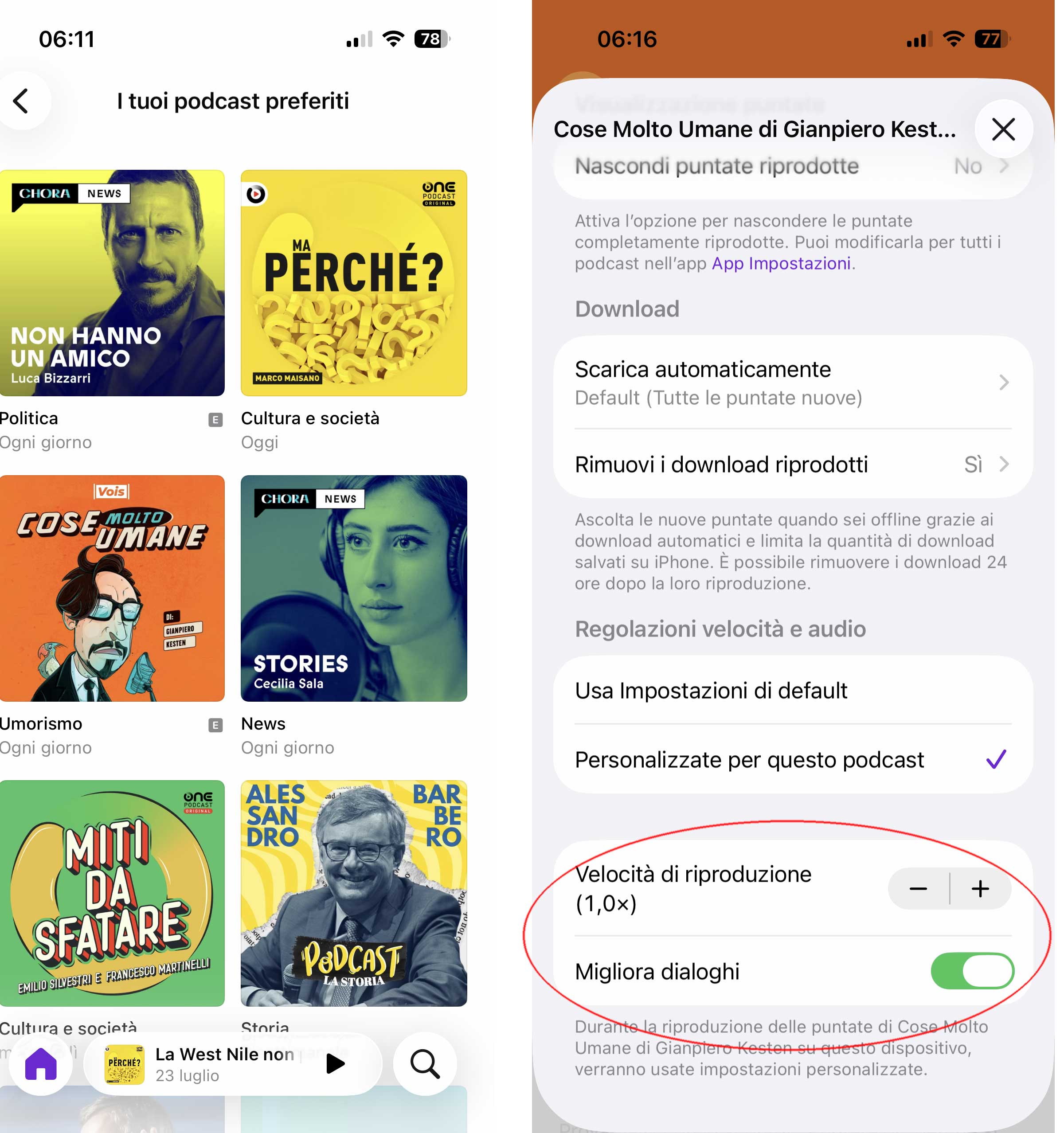 Oltre a “Migliora dialoghi”, iOS 26 memorizza per ciascun podcast le scelte di riproduzione, così ogni feed “suona” come piace a te senza toccare settaggi globali.