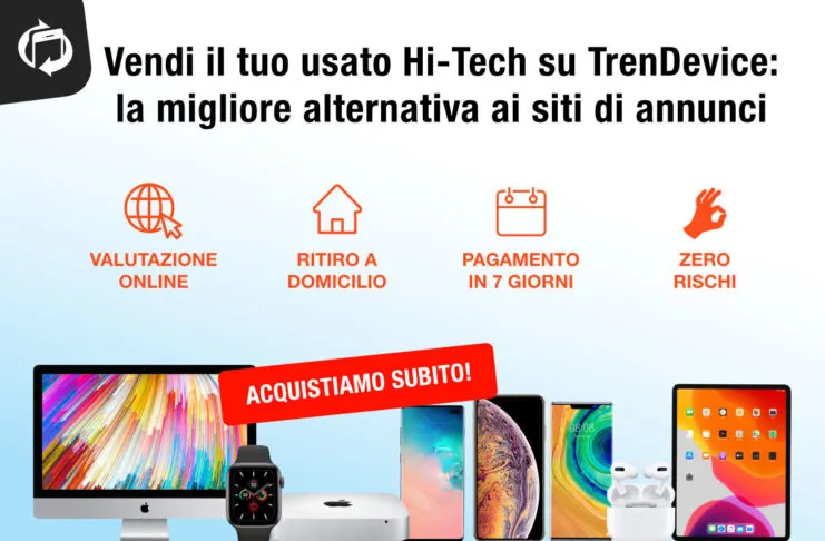 Se volete vendere il vostro usato Hi-Tech senza perdere tempo, in modo facile, veloce e sicuro, TrenDevice è il miglior sito dove vendere il vostro dispositivo usato, anziché sui siti di annunci ed aste online; risparmierete perdite di tempo in trattative con i privati che spesso si concludono in un nulla di fatto. Vendendo il vostro usato direttamente a TrenDevice eviterete lo stress di gestire i vostri annunci, le trattative con gli acquirenti (spesso indecisi), e non dovrete preoccuparvi neppure della spedizione: l’azienda ritira a proprie spese il vostro dispositivo con il Corriere Assicurato di fiducia presso l’indirizzo che voi indicherete. Dopo 7 giorni lavorativi, riceverete il pagamento concordato, direttamente sul vostro conto corrente.