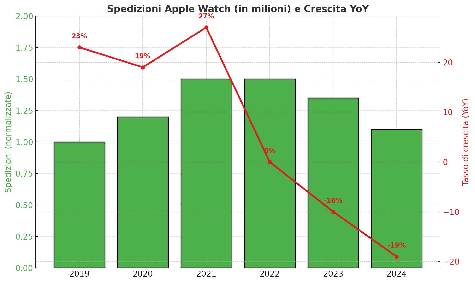 Numeri che che preoccupano perché non arrivano isolati, ma sono figli di un trend costante che si è approfondito nel 2024 ma che è iniziato già nel 2022, quando per la prima volta Apple Watch aveva rallentato limitandosi a pareggiare le vendite dell’anno precedente. Poi nel 2023 si era avuto il primo calo, con una riduzione del 10% anno su anno rispetto al 2022.
