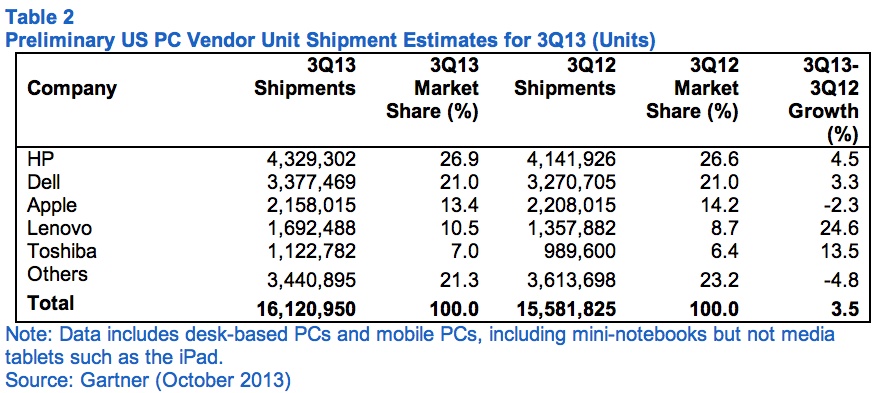 Per Gartner Apple ha consegnato 2,1 milioni di Mac un calo del 2,3% rispetto al terzo trimestre del 2012 quando erano state rilevate spedizioni di 2,2 milioni di Mac. Apple è terzo costruttore in USA con il 13,4% in calo rispetto al 14,2 del 2012. Il quadro appare decisamente più negativo invece nei dati preliminari di IDC secondo cui Apple è sempre terzo costruttore in USA ma con un calo percentuale dell’11,2% con 1,9 milioni di Mac spediti, un calo a doppia rispetto ai 2,14 milioni di Mac spediti nel Q3 del 2012.