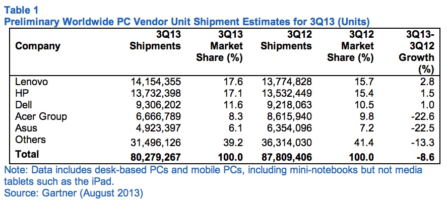 Tra le tendenze principali che hanno caratterizzato il terzo trimestre del 2013 gli analisti di Gartner evidenziano il rinnovo dei magazzini per sostituire i PC precedenti con le nuove versione con Haswell, mentre rimane costante l’erosione delle vendite dei PC tradizionali generata dai tablet, soprattutto quelli Android a basso costo che stanno sempre più riscuotendo successo come sistemi principali nei mercati emergenti oppure come dispositivo secondario nei mercati più maturi. Nelle prossime settimane le società di analisi rilasceranno report più precisi con percentuali e numeri di vendita, oltre che i dettagli per le singole nazioni. Con i dati definitivi sarà possibile analizzare meglio e più in dettaglio le differenze tra le prestazioni di Apple in USA registrate da Gartner e IDC. Infine occorre tenere presente che nessuna di queste due società di analisi prende in considerazione i tablet nelle spedizioni totali di PC: la posizione e i risultati di Apple sul mercato cambiano sensibilmente includendo iPad nei conteggi.