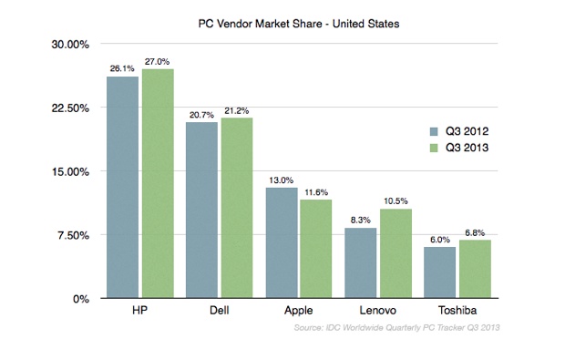 Il calo di Apple risulta ancora più evidente se confrontato con l’andamento complessivo del mercato PC in USA che è in crescita per il secondo trimestre consecutivo, secondo Gartner del 3,5%. Apple risulta così l’unico dei primi 5 costruttori in USA a segnare un andamento negativo. Oltreoceano HP rimane ancora prima con il 26,9% del mercato e una crescita del 4,5%, seconda è Dell con il 21% del mercato e una crescita del 3,3%. Lenovo è quarta dopo Apple con il 10,5% e la crescita più alta di tutti pari al 24,6% infine Toshiba quinta con il 7% del mercato e una crescita del 13,5%.