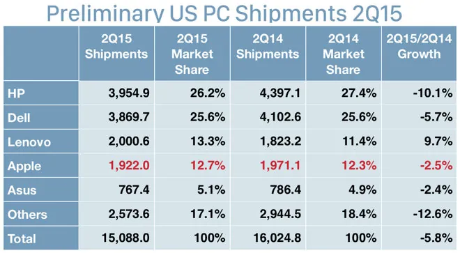 Secondo la società di analisi, Apple ha venduto nell’ultimo trimestre 5.14 milioni di computer, piazzandosi al quarto posto dietro Lenovo, HP e Dell. Queste ultime hanno venduto rispettivamente 13.44 milioni, 12.25 milioni e 9.56 milioni di unità. Dopo Apple troviamo Acer e Asus tutte e due con rispettivamente circa 4.33 milioni di unità, con numeri leggermente migliori per Acer.