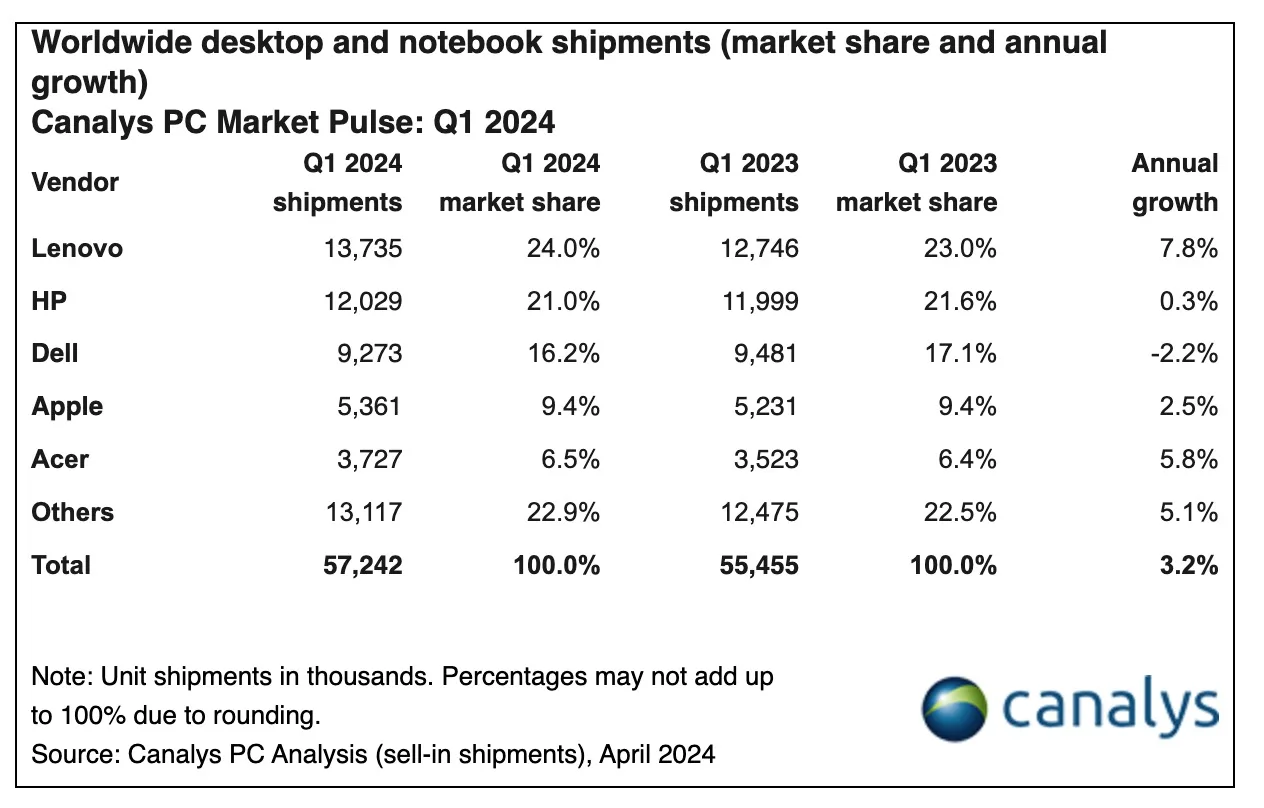 Nonostante il dato positivo sia minimo, siamo di fronte ad un passo avanti rispetto al 2023. Ricordiamo che lo scorso anno il primo trimestre aveva fatto segnare nei numeri di Canalys un terrificante -32,6% rispetto allo stesso periodo del 2022.