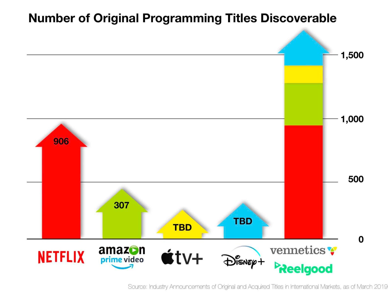 Il pubblico della TV lineare continua a diminuire mentre la domanda di consumo on-demand continua a crescere al punto che i fornitori di servizi stanno rispondendo con le loro capacità di recupero e on-demand. Tuttavia, un catalogo on-demand che consiste semplicemente dei film e telefilm più popolari risulta inadeguato per gli utenti che vogliono scoprire contenuti nuovi e originali. Gli utenti di streaming vogliono scegliere tra i contenuti più interessanti in modo facile. Vennetics e Reelgood affermano di soddisfare questa esigenza per i fornitori di servizi, compresi il nuovo catalogo Apple TV+ e tutti gli altri principali contenuti VoD, supportando un caso commerciale che genera un nuovo flusso di utili sempre maggiore.