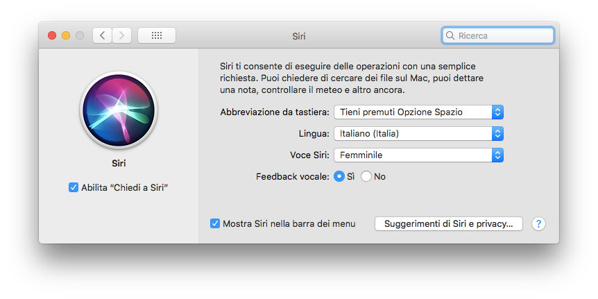Se Siri non è attivo sul vostro Mac, potete attivarlo andando in Preferenze di Sistema, selezionando “Siri” e mettendo il segno di spunta sull’opzione “Chiedi a Siri”. Da qui è possibile specificare l’eventuale abbreviazione di tastiera da usare, la lingua da usare, il tipo di voce dell’assistente (maschile o femminile), il feedback vocale (disattivando il feedback vocale, la risposta di Siri viene mostrata nella finestra di Siri ma non viene letta ad alta voce), scegliere se mostrare o no l’icona di Siri nella barra dei menu. Se Siri non riesce a connettersi alla rete o chiede di riprovare più tardi, bisogna controllare la connessione a internet. Se abbiamo un Mac senza microfono integrato (es. Mac mini) possiamo usare un microfono esterno (es. un microfono USB) o degli auricolari Bluetooth.