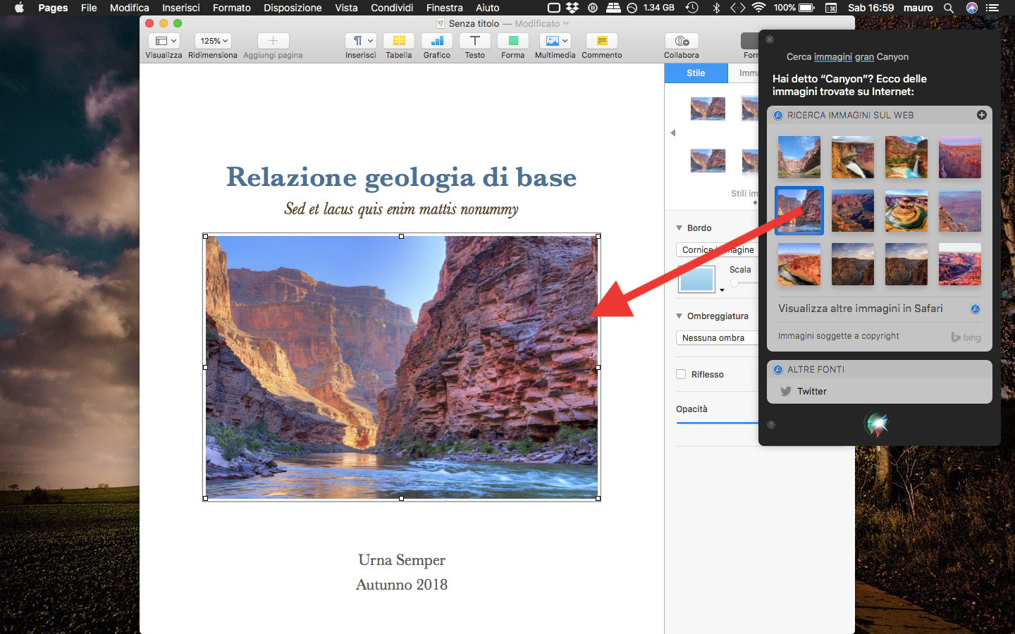 Si possono sfruttare comandi del tipo: “Cerca immagini della Torre Eiffel su internet”. È possibile trascinare alcuni tipi di informazioni trovate da Siri in una finestra o un’applicazione sulla Scrivania. Dopo aver chiesto a Siri di trovare un’immagine sul web, è anche possibile trascinare uno dei risultati in un documento Pages o altra applicazione.