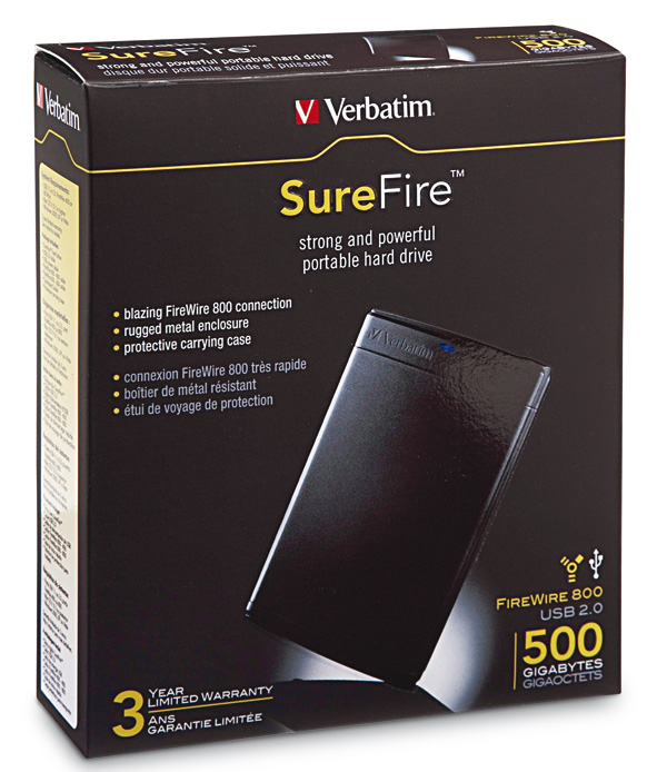 Verbatim ha presentato la nuova linea di dischi fissi portatili SureFire caratterizzati da dimensioni compatte, telaio in alluminio e dotati di doppia porta di collegamento per offrire il massimo delle possibilità di utilizzo per gli utenti Mac e Windows. Oltre alla porta USB 2.0 i nuovi dischi compatti Verbatim SureFire integrano anche la più veloce FireWire 800: i dischi disponibili nelle capacità di 250GB, 320GB e 500GB sono pre-formattati per lavorare con il Mac. Oltre ai cavi di collegamento nella confezione è inclusa una custodia per il trasporto: negli Stati Uniti i dischi SureFire sono proposti al prezzo di 110 dollari per il 250GB, 140 dollari per il 320GB e 180 dollari per il 500GB.