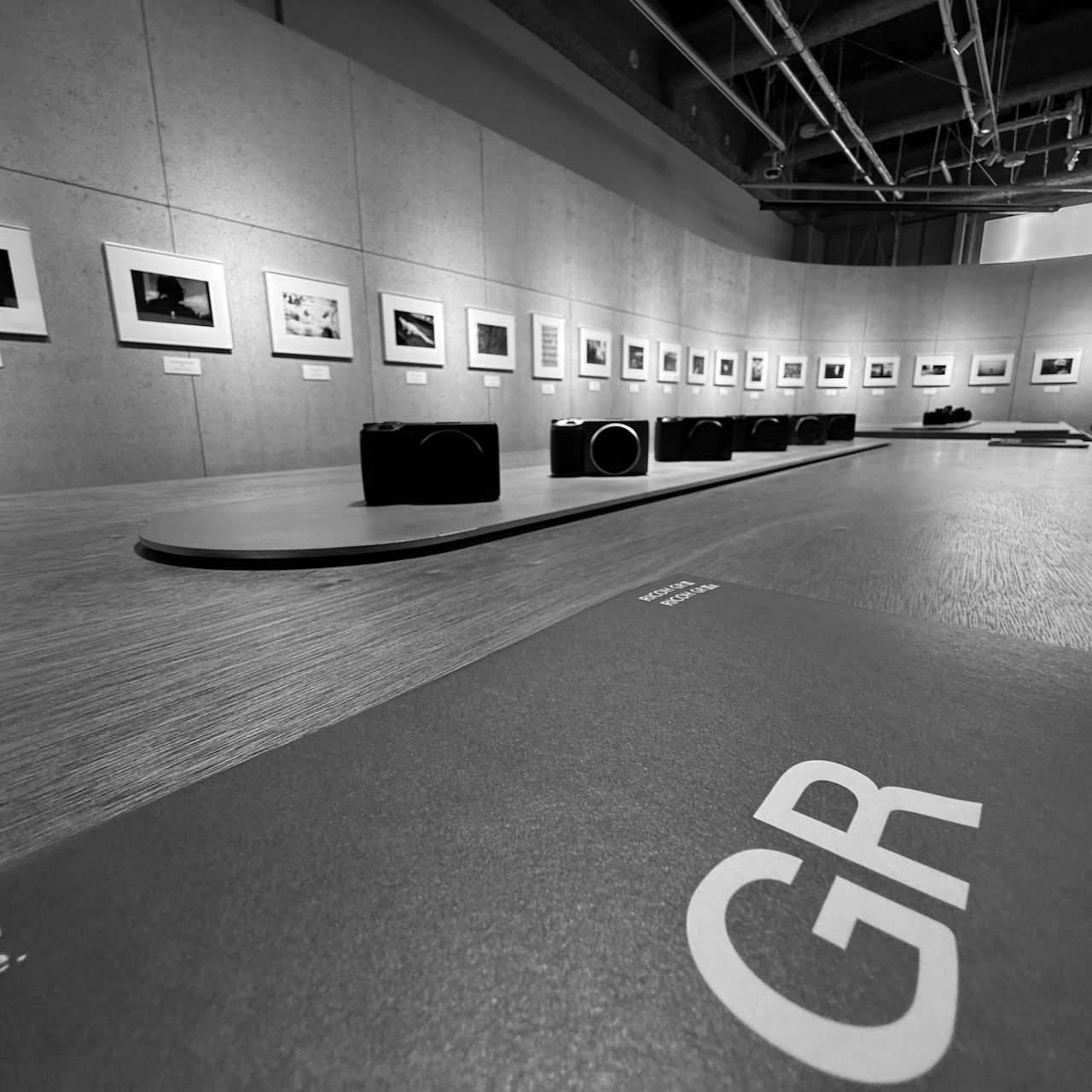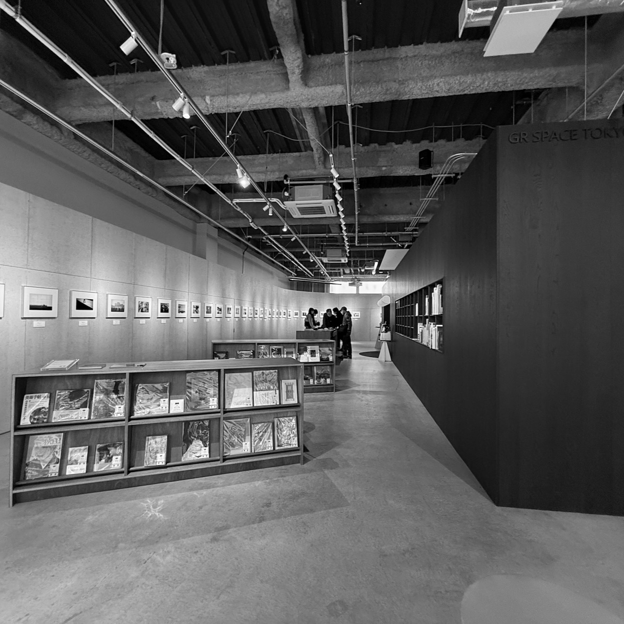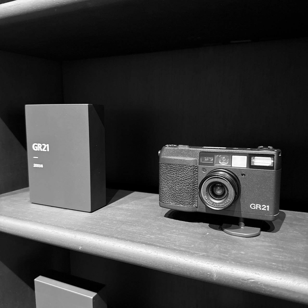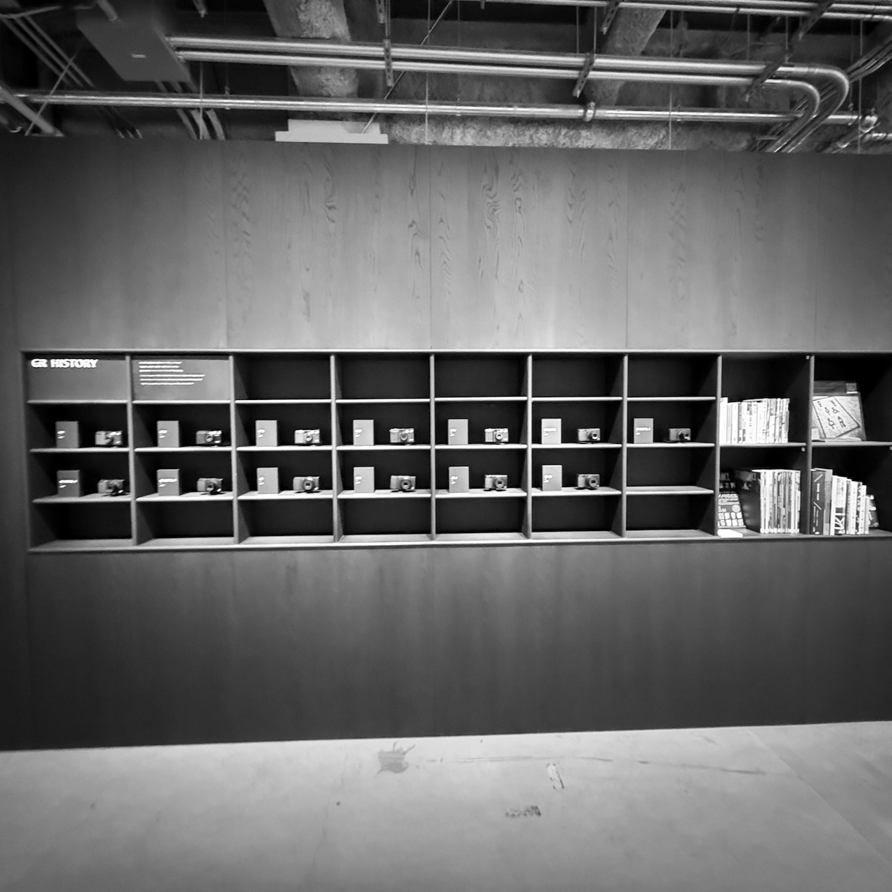 Il design degli interni dello spazio GR riflette perfettamente l’estetica minimalista giapponese applicata al mondo della fotografia. L’illuminazione soffusa crea un’atmosfera contemplativa che invita alla riflessione più che all’acquisto compulsivo. Le superfici sono pulite, i volumi geometrici, i materiali naturali: legno, vetro e metallo scuro si combinano per creare uno spazio che sembra sospeso tra galleria d’arte contemporanea e biblioteca specializzata. L’impressione generale è quella di trovarsi in un luogo dedicato alla conservazione di una memoria collettiva, un archivio vivente della cultura fotografica urbana.