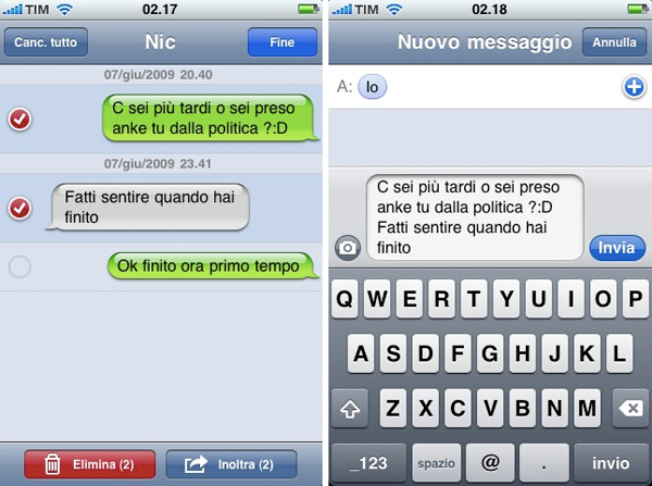 Come consueto su iPhone, gli sms appaiono a guisa ci conversazioni chat, visualizzazione molto comoda che consente di avere una visione di insieme di uno scambio di messaggi avvenuto con lo stesso contatto. Finalmente possiamo cancellare i singoli messaggi e non soltanto l’intera conversazione e inoltrarli a un altro destinatario: è sufficiente toccare Modifica quindi spuntare i messaggi da cancellare o inoltrare.