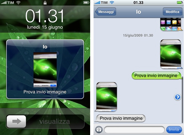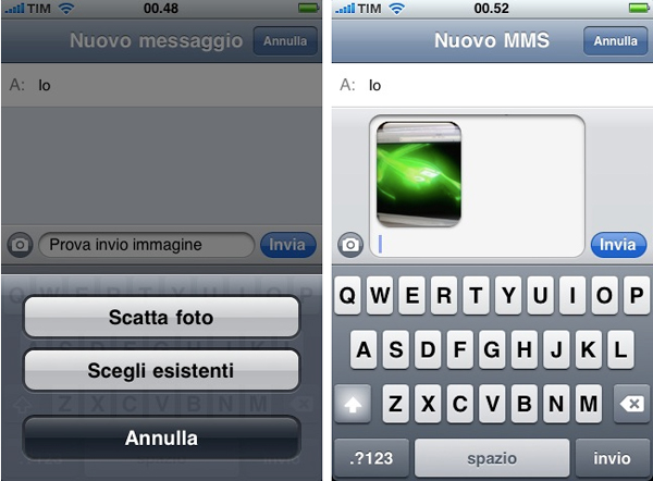 Accanto al campo del messaggio appare adesso l’icona di una macchina fotografica per l’invio degli MMS. Con un iPhone sbloccato (quello a prezzo pieno) con TIM e Vodafone la configurazione è automatica, con Tre e Wind è invece necessario procedere all’impostazione dei parametri MMS reperibili sui rispettivi siti. Sfiorando il pulsantino della macchina fotografica potremo inviare un’immagine scegliendo tra quelle esistenti o scattandola sul momento.