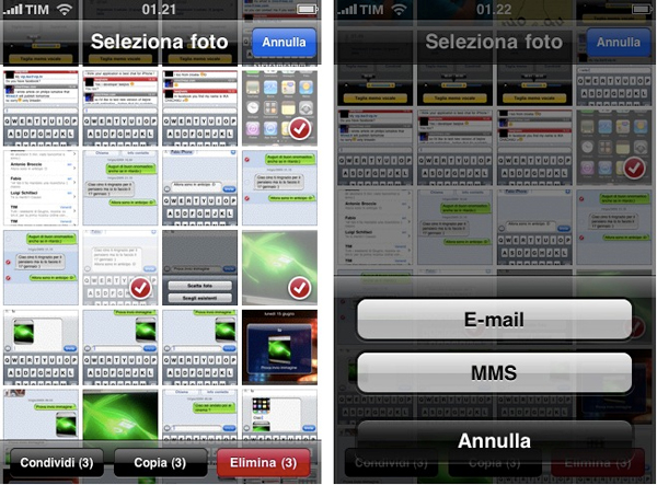 Ripetendo gli stessi passaggi possiamo allegare fino a 5 foto. Se abbiamo la necessità di inviare più di un’immagine possiamo anche fare una selezione multipla a priori quindi inoltrare come MMS le immagini selezionate. Apriamo la nostra galleria fotografica e sfioriamo l’icona a forma di busta. A questo punto tocchiamo le immagini che intendiamo inviare e poi sfioriamo Condividi: un menu ci consentirà l’invio via email o MMS.