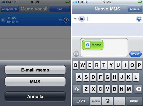 iPhone OS 3.0 integra anche una nuova applicazione per la registrazione di memo vocali che possiamo condividere via email e MMS. Da Memo vocali selezioniamo la registrazione da inviare, sfioriamo Condividi e scegliamo MMS.