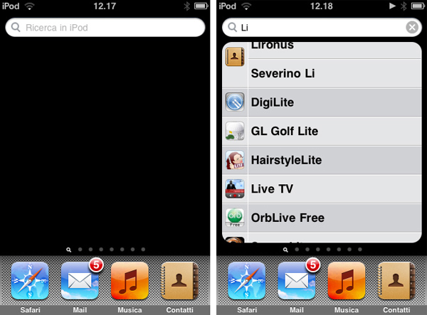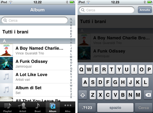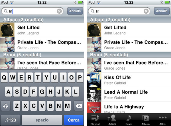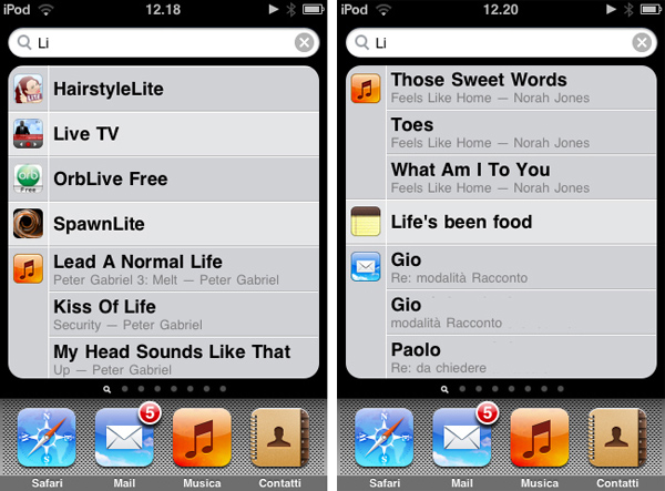 Oltre a questo Apple ha inserito l’opzione di ricerca anche all’interno della applicazione iPod rendendola simile a quella già presente nei contatti; la lista alfabetica di brani, artisti e album ora riporta sulla sua sommità una lente di ingrandimento: facendo scorrere il pollice verso l’alto fino alla lente si attiverà lo spazio per l’inserimento del termine di ricerca all’interno del solo contenuto musicale del vostro iPod touch o iPhone senza confonderlo con dati di altro tipo.