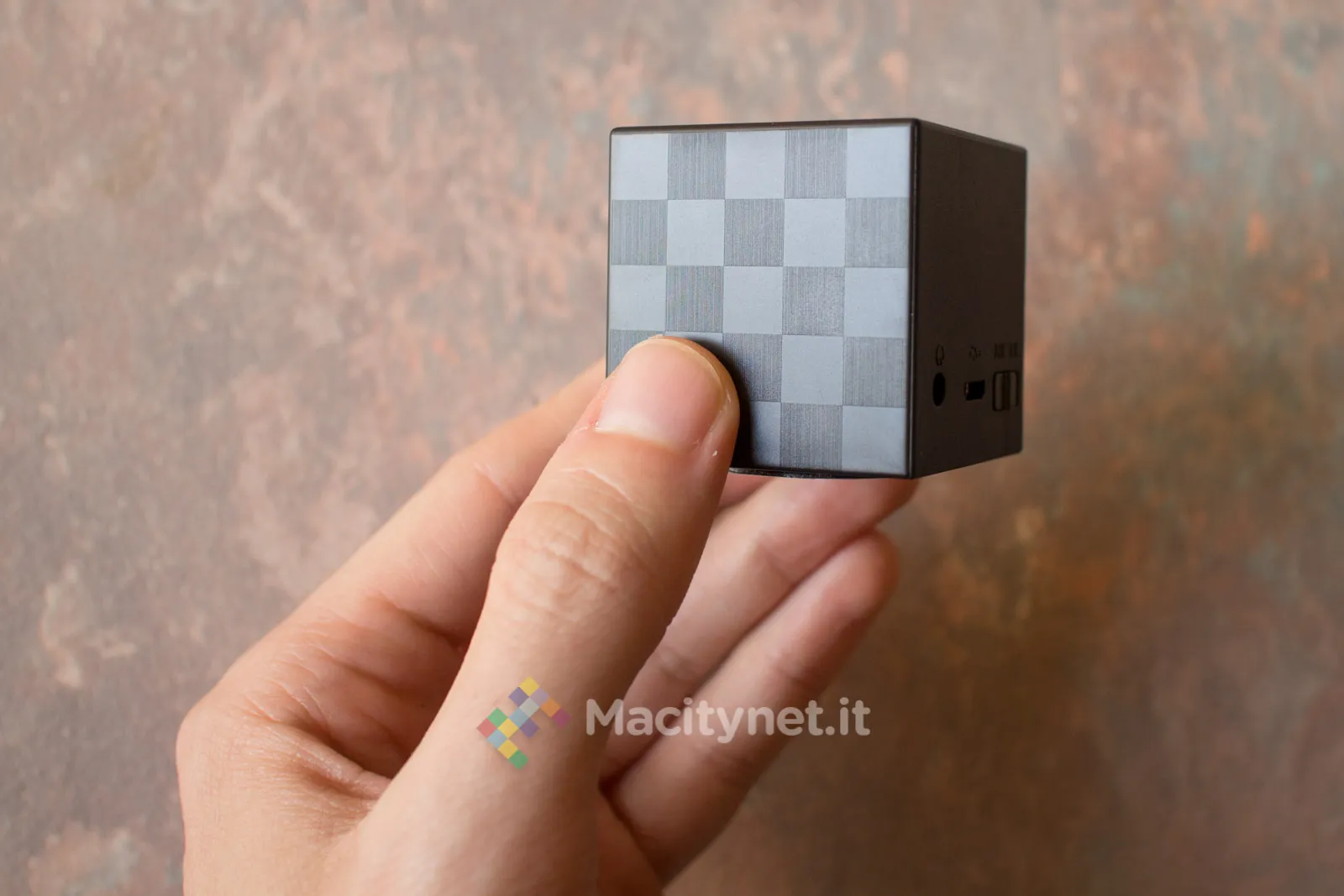 Come accennato è di forma cubica ed è piuttosto piccolo anche in mano, nello specifico il lato misura 3,9 centimetri ed è anche leggerissimo, pesa appena 37 grammi. Alla base c’è un adesivo gommato che funge da piedino antiscivolo, mentre sul lato basso di uno dei lati troviamo la presa jack da 3,5 millimetri, l’ingresso microUSB per la ricarica e l’unico interruttore per alternare la modalità di utilizzo tra ricevitore (RX) e trasmettitore (TX).