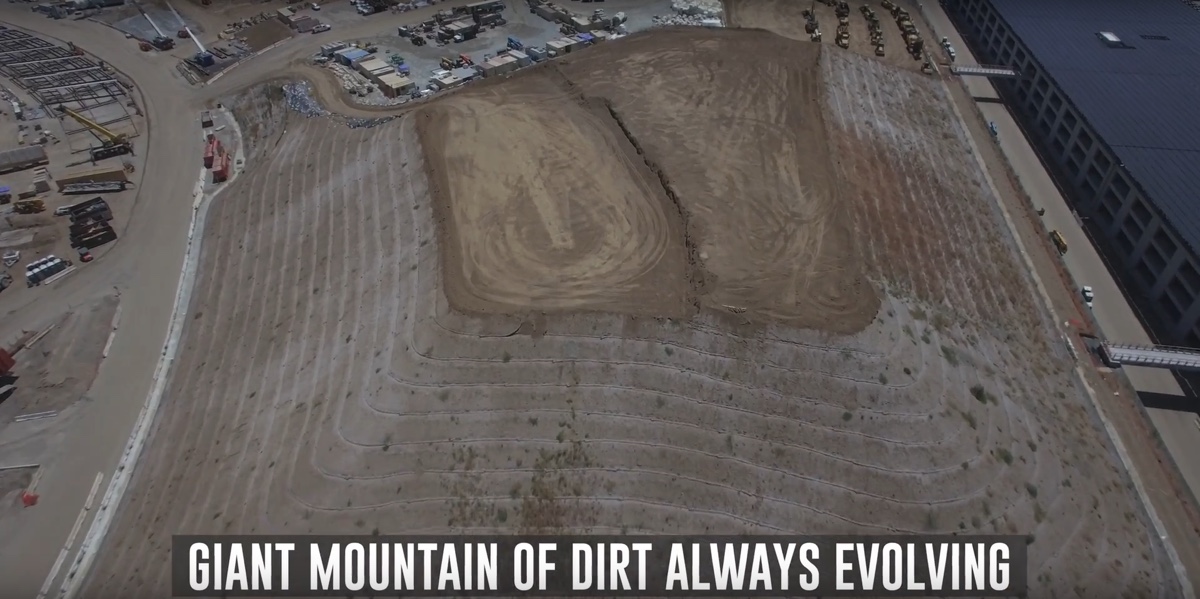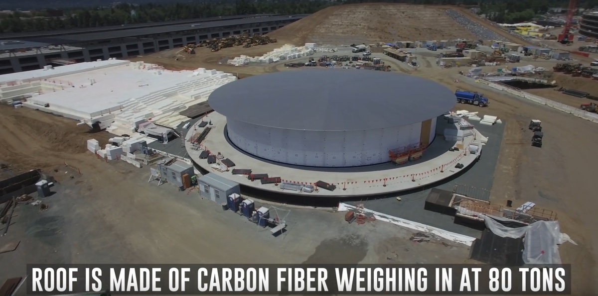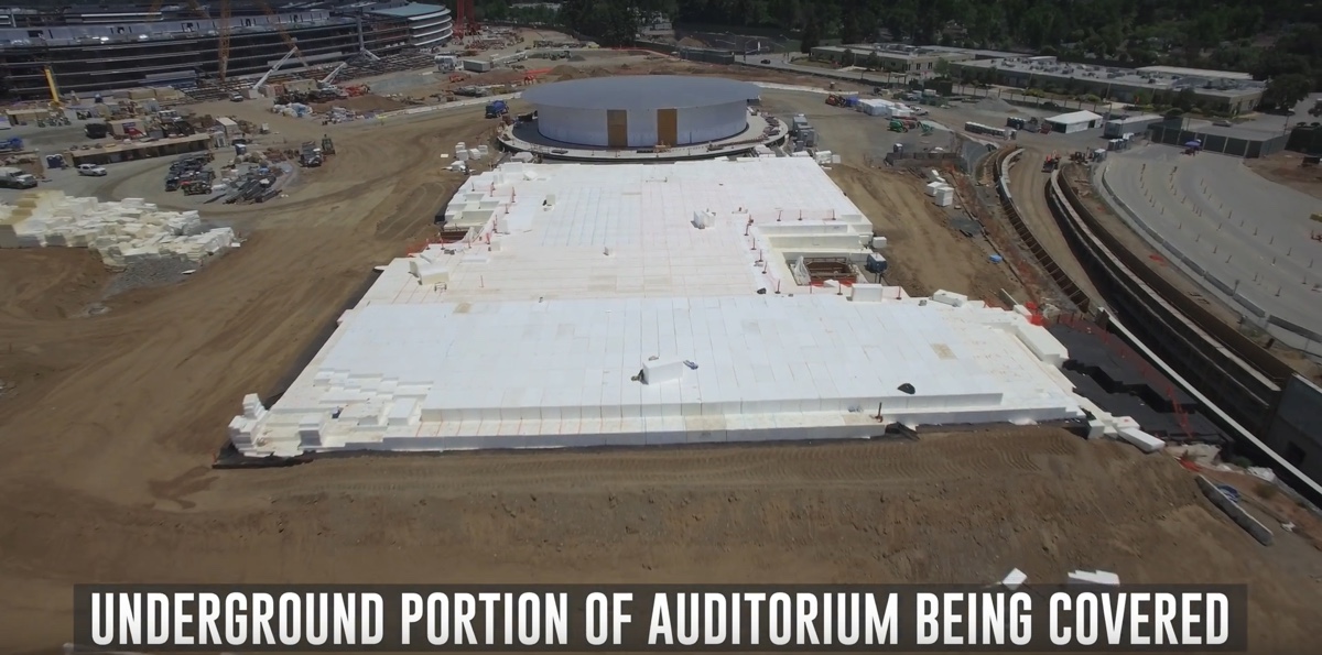 Nonostante le dimensioni immani e la capacità di ospitare circa 12.000 dipendenti, l’astronave di Apple sarà climatizzata con sistemi passivi, sia per il riscaldamento d’inverno che per il raffreddamento e la circolazione dell’aria in estate. Il filmato mostra progressi consistenti anche per il nuovo Auditorium, sovrastato da un tetto in fibra di carbonio e ora affiancato da una sorta di scalinata finora non apparsa nei rendering: la sala principale sotterranea dove si svolgeranno Keynote e presentazioni Apple è ora interamente coperta.