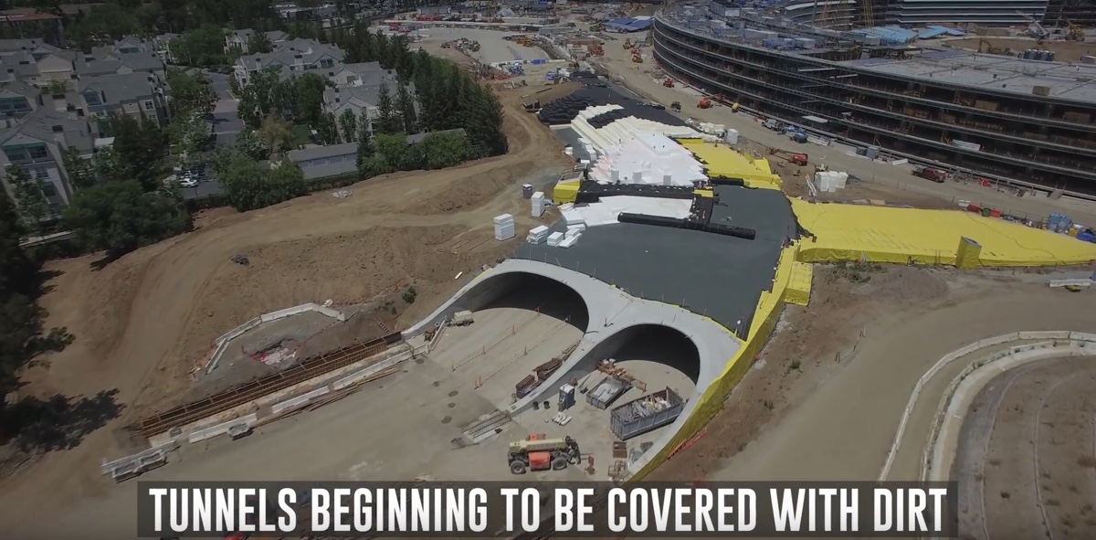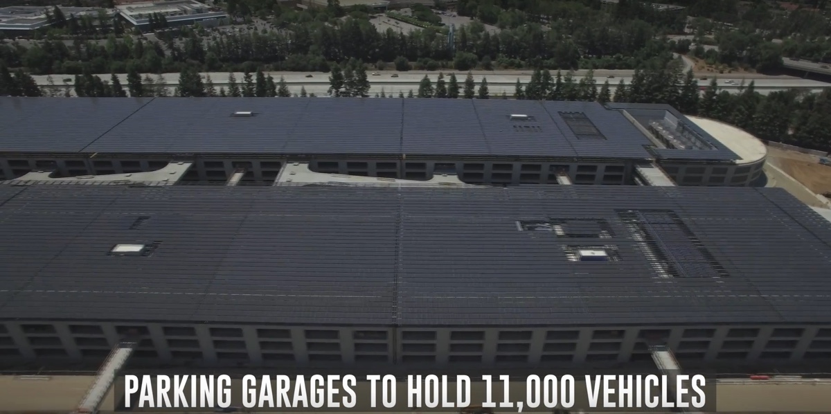 Praticamente già completati invece gli edifici dei parcheggi principali, in grado di ospitare fino a 11.000 auto, anche questi dotati di pannelli solari sui tetti. Nel cantiere continua a innalzarsi ed aumentare di volume la montagna di terra e detriti segnalata da Tim Cook in una intervista di alcuni mesi fa: tutto questo materiale non verrà trasportato e scartato ma verrà impiegato sul sito per creare parchi e giardini.