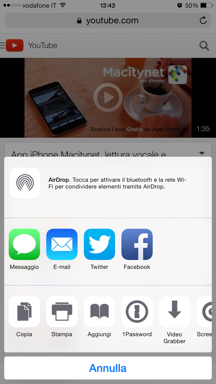 La comodità dell’applicazione risiede infatti proprio nel poter creare una raccolta di filmati sempre disponibili, anche quando non si ha una potente copertura internet ed in generale in tutte quelle situazioni come viaggi in treno, auto, aereo e via discorrendo. Una volta installata, non è obbligatorio interagire con l’app per cominciare a scaricare i video: sarà infatti sufficiente aprire Safari ed abilitare l’estensione cliccando il pulsante di condivisione della pagina web e successivamente sul pulsante ‘more’ delle Attività, attivando l’apposito interruttore. Da questo momento, che si tratti di un video YouTube, Vimeo, Dailymotion, SoundCloud, Funny or Die (sono oltre 250 i siti di streaming attualmente supportati) sarà sufficiente cliccare sull’icona Video Grabber ed attendere il completamento del download, mentre si può tranquillamente continuare a navigare in internet.