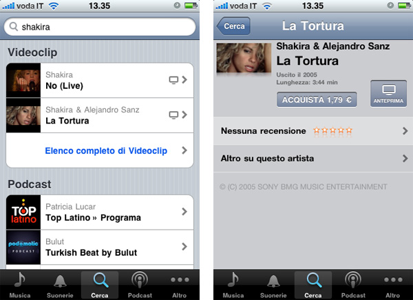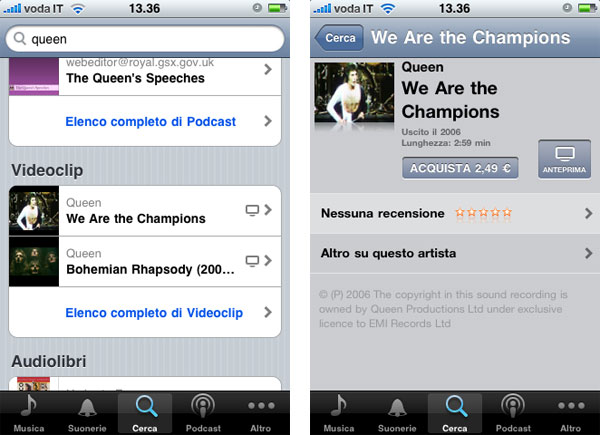Qui in basso alcuni esempi e schermate catturate da iPhone: la ricerca per Shakira e il video della canzone La tortura, successivamente una ricerca per i Queen e il video We are the champions. Sono centinaia i video musicali disponibili fin dal primo giorno del lancio su iTunes Store.