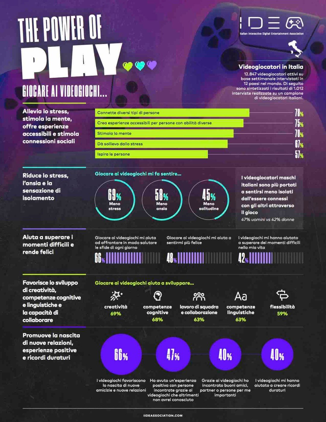 Secondo gli oltre 1.000 videogiocatori italiani coinvolti, i videogiochi hanno diversi benefici: stimolano la mente (70%), connettono diversi tipi di persone (78%), creano esperienze accessibili per persone con abilità diverse (75%).