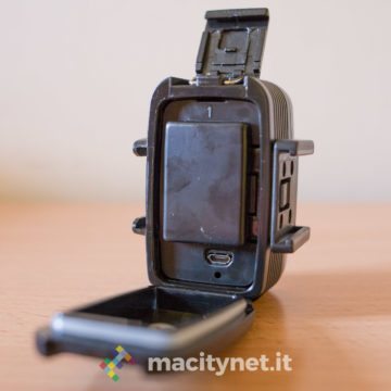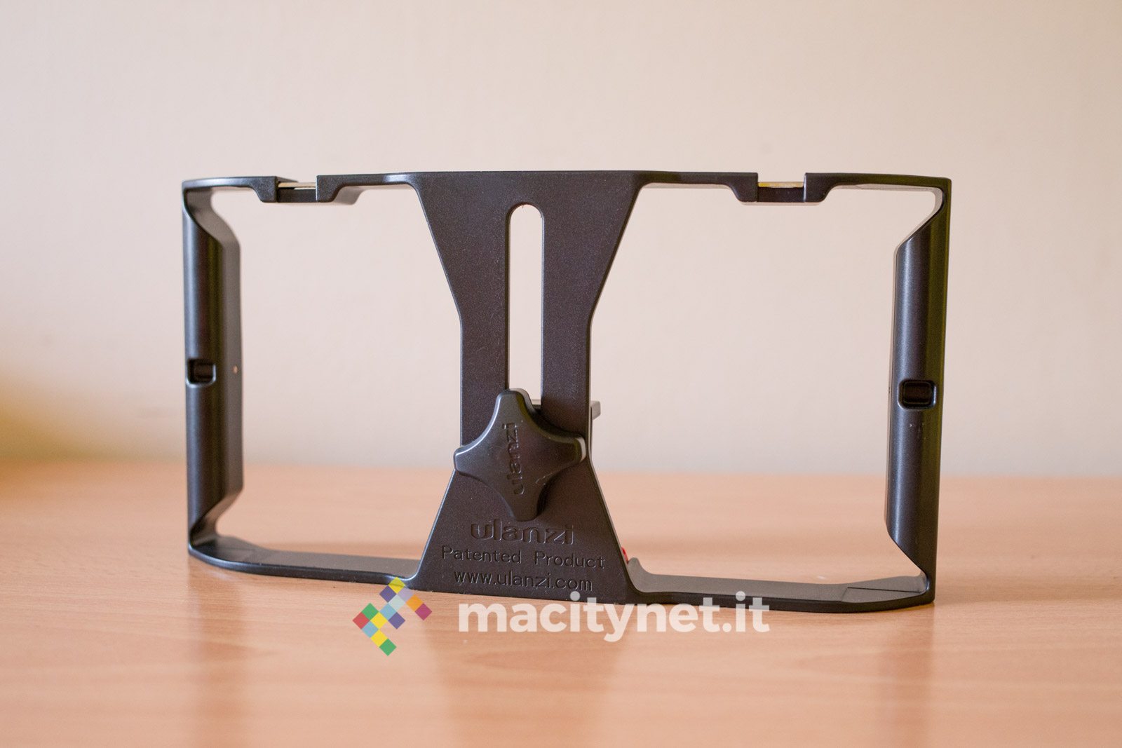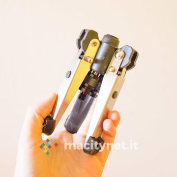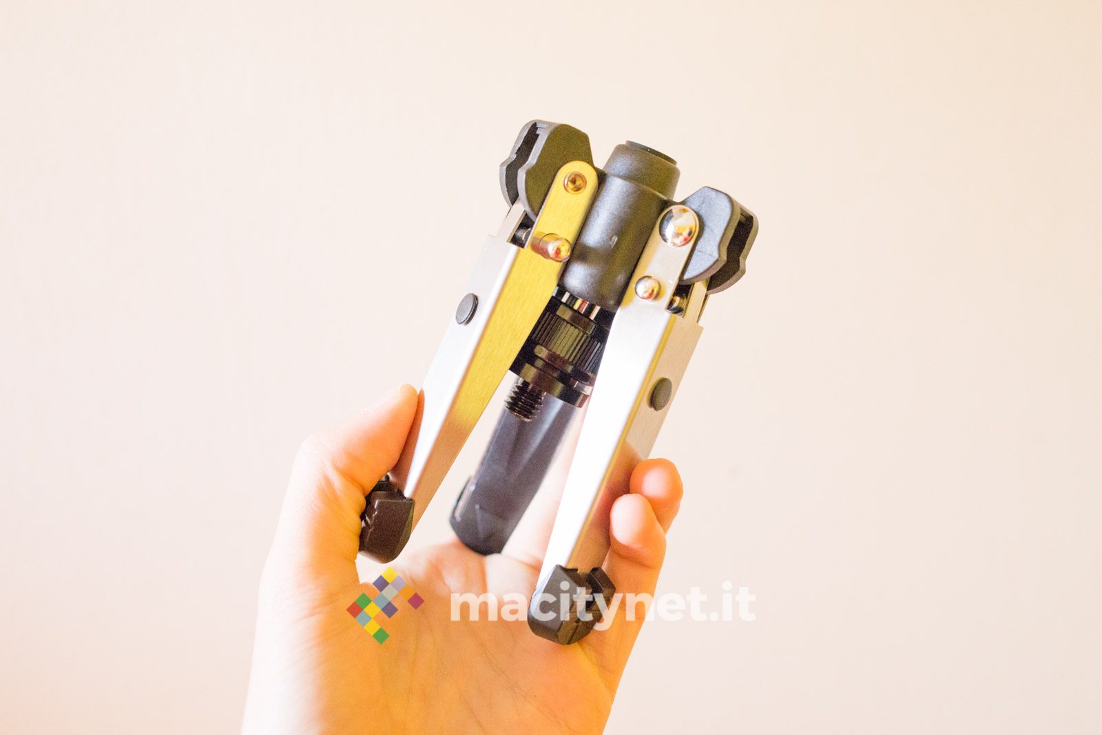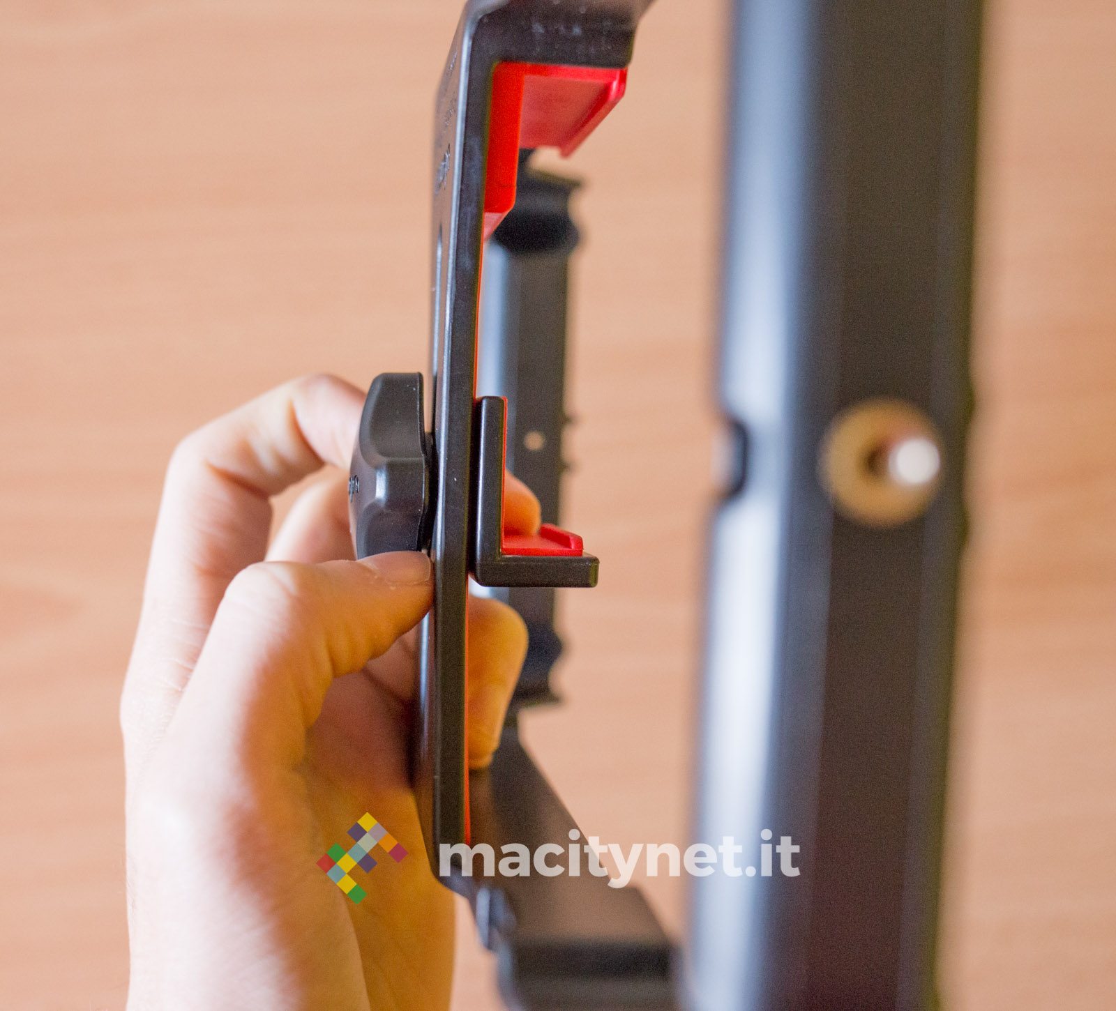 La sola maniglia migliora molto l’impugnatura di uno smartphone, soprattutto quando lo si utilizza per riprese scomode come quelle rasoterra o sporgendosi da un’automobile. Soprattutto se si indossano guanti risulta uno strumento molto robusto e comodo da tenere in mano, pesa pochissimo anche con uno smartphone annesso, che resta saldamente bloccato dalla morsa. Bisogna solo fare attenzione alla posizione dei pulsanti laterali: ad esempio un iPhone non bisognerà posizionarlo perfettamente al centro perché si rischia di schiacciare nella morsa il tasto Volume (+) che permette di avviare/fermare le registrazioni, così come con uno smartphone Android si potrebbe erroneamente schiacciare il pulsante di Standby e spegnere il telefono (ci è successo durante alcuni test con un dispositivo Oukitel).
