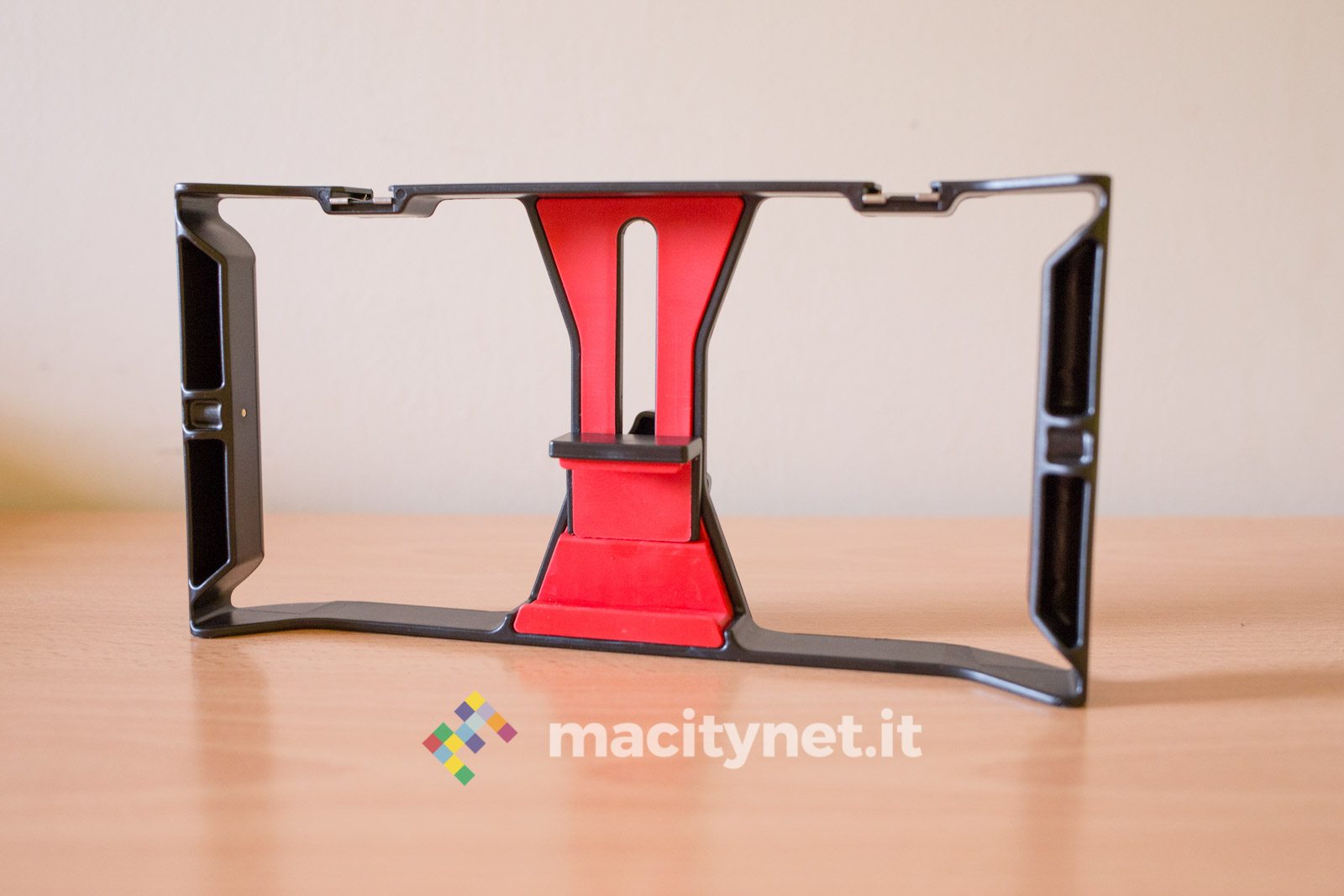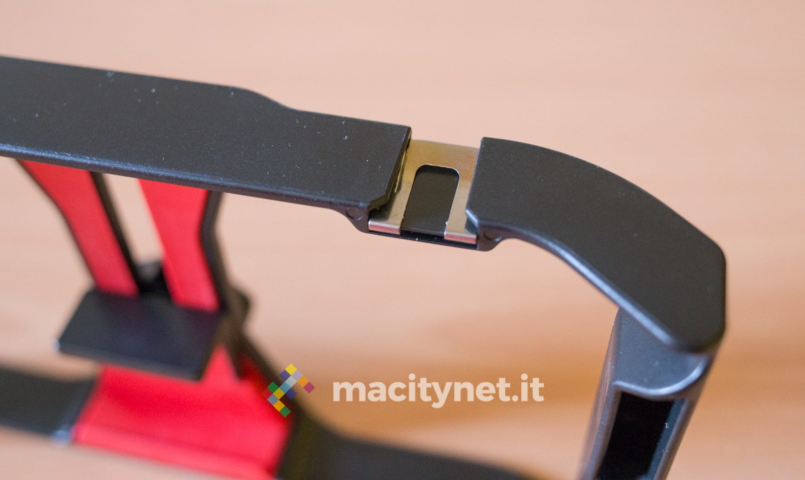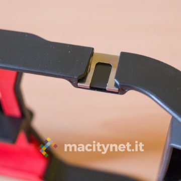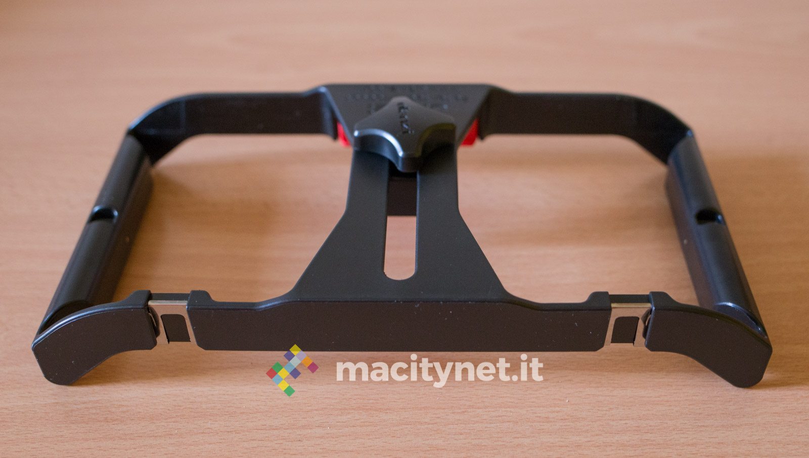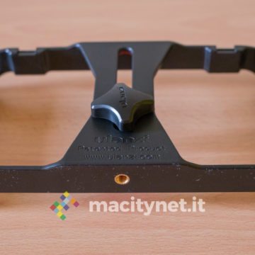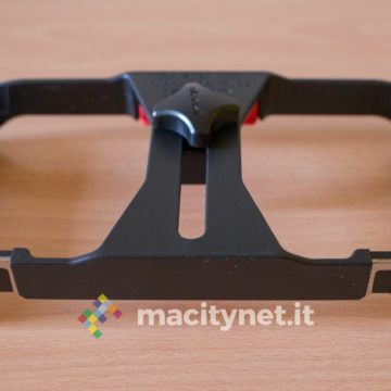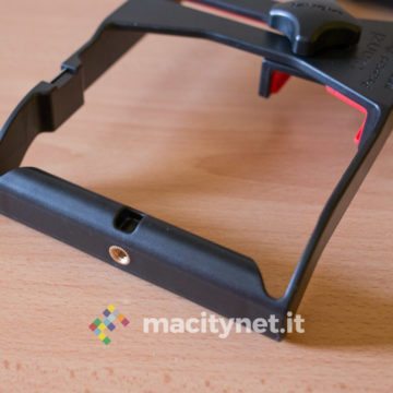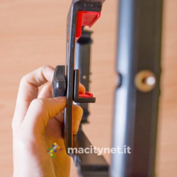 La parte più elaborata è la staffa centrale, composta da una spessa imbottitura in silicone (riconoscibile in foto dal colore rosso) che aumenta l’aderenza dello smartphone fissato nella pinza incorporata. Quest’ultima, anziché essere gestita dal classico sistema a molla, viene controllata da un’ampia vite che si regola sul retro, una scelta che abbiamo apprezzato perché risulta più immediata nell’utilizzo e sicuramente più duratura nel tempo.