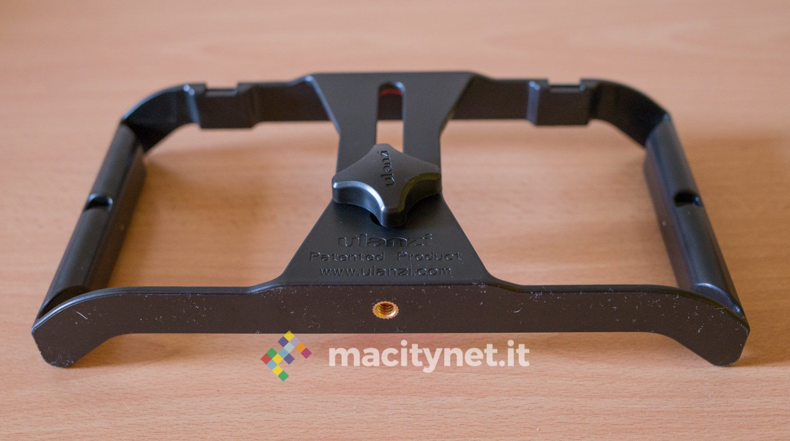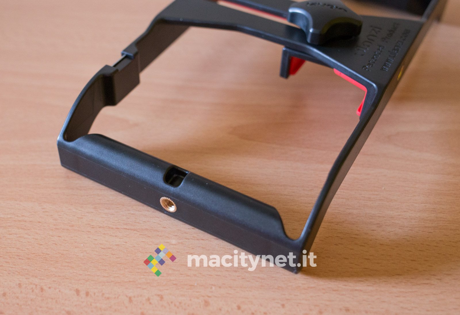 Questo strumento presenta tre attacchi a vite, uno sulla base e gli altri due ai bordi esterni delle maniglie, permettendo così di fissarlo eventualmente ad un treppiede sia in posizione orizzontale, sia in quella verticale. Sulla staffa superiore ci sono, ai lati, due aperture con il classico attacco dei flash speedlite che permette di agganciare microfoni esterni, torce LED e altri accessori utili durante le riprese.