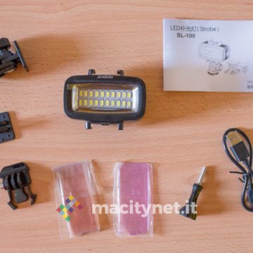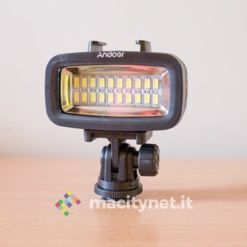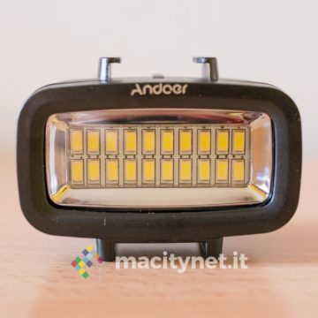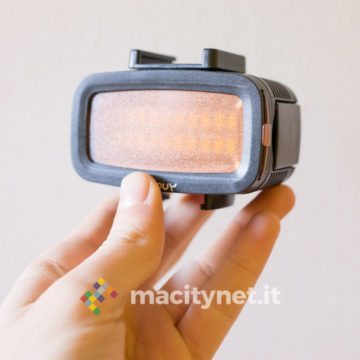 Sulla base c’è la slitta per agganciare l’attacco per treppiede che, per la conformazione, collabora anche con le slitte per i flash, o per l’attacco utile per il fissaggio ad un’asta per selfie, sul lato opposto c’è invece l’attacco universale a slitta compatibile con gli accessori per action cam. Sulla facciata frontale una copertura in plastica trasparente protegge i 20 LED incorporati e una feritoia laterale permette di agganciare i due diffusori arancione e rosa che permettono di virare leggermente la luce della torcia: sono accessori molto utili perché permettono di gestire diversamente il bilanciamento in camera ed ottenere dei colori finali molto più naturali. Ad esempio il filtro arancione si può utilizzare con la modalità del bilanciamento del bianco impostata su “Tungsteno” o toni freddi per avere un bilanciamento dei colori neutro, soprattutto per quanto riguarda i volti dei soggetti inquadrati.