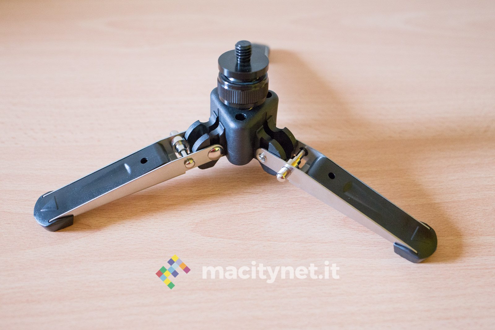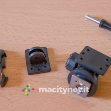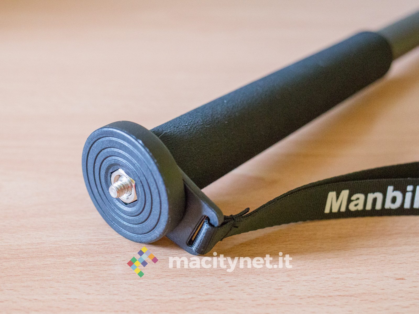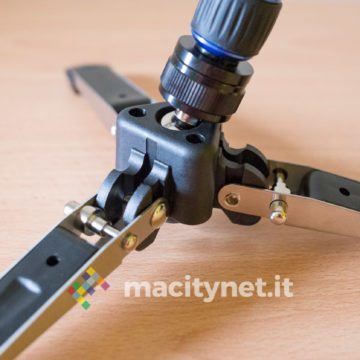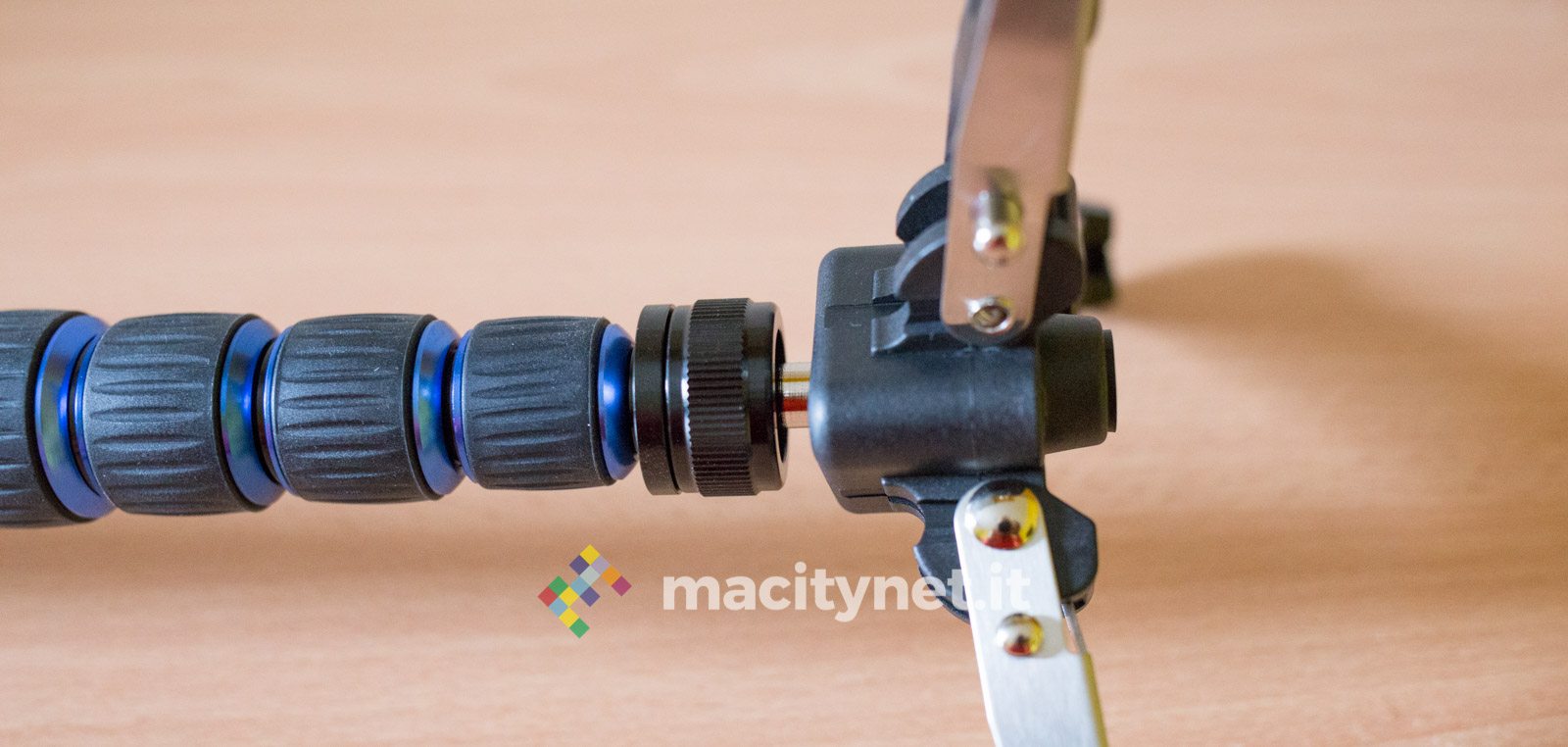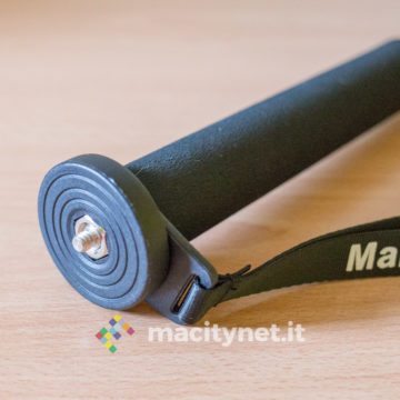 Il manico è rivestito da una struttura in spugna molto ampia e nel lato superiore c’è anche un laccio da polso che può eventualmente essere rimosso. La maniglia per stabilizzare le riprese video con lo smartphone o una qualsiasi fotocamera si fissano nell’apposita vite da ¼’’ accompagnata da una spessa base circolare (5 cm di diametro).